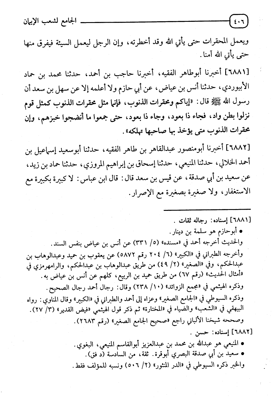 6881 - أَخْبَرَنَا أَبُو طَاهِرٍ الْفَقِيهُ، أَنَا حَاجِبُ بْنُ أَحْمَدَ، نا مُحَمَّدُ بْنُ حَمَّادٍ الْأَبْيُورْدِيُّ، نا أَنَسُ بْنُ عِيَاضٍ اللَّيْثِيُّ، عَنْ أَبِي حَازِمٍ، وَلَا أَعْلَمُهُ إِلَّا عَنْ سَهْلِ بْنِ سَعْدٍ، أَنَّ رَسُولَ اللهِ صَلَّى اللَّهُ عَلَيْهِ وَسَلَّمَ قَالَ: " §إِيَّاكُمْ وَمُحَقَّرَاتِ الذُّنُوبِ، فَإِنَّمَا مَثَلُ مُحَقَّرَاتِ الذُّنُوبِ كَمَثَلِ قَوْمٍ نَزَلُوا بِبَطْنِ وَادٍ، فَجَاءَ ذَا بِعُودٍ، وَجَاءَ ذَا بِعُودٍ، حَتَّى جَمَعُوا مَا أَنْضَجَ خُبْزَهُمْ، وَإِنَّ مُحَقَّرَاتِ الذُّنُوبِ مَتَى يَأْخُذُهَا صَاحِبُهَا تُهْلِكُهُ "
