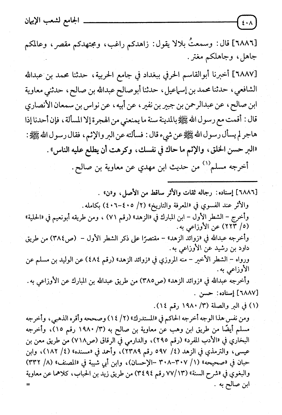 6887 - أَخْبَرَنَا أَبُو الْقَاسِمِ الْحُرْفِيُّ، بِبَغْدَادَ، نا مُحَمَّدُ بْنُ عَبْدِ اللهِ الشَّافِعِيُّ، نا مُحَمَّدُ بْنُ إِسْمَاعِيلَ، نا أَبُو صَالِحٍ، نا عَبْدُ اللهِ بْنُ صَالِحٍ، حَدَّثَنِي مُعَاوِيَةُ بْنُ صَالِحٍ، عَنْ عَبْدِ الرَّحْمَنِ بْنِ جُبَيْرِ بْنِ نُفَيْرٍ، عَنْ أَبِيهِ، عَنْ نَوْاسِ بْنِ سَمْعَانَ الْأَنْصَارِيِّ، قَالَ: أَقَمْتُ مَعَ رَسُولِ اللهِ صَلَّى اللَّهُ عَلَيْهِ وَسَلَّمَ بِالْمَدِينَةِ سَنَةً مَا يَمْنَعُنِي مِنَ الْهِجْرَةِ إِلَّا الْمَسْأَلَةُ، فَإِنَّ أَحَدَنَا إِذَا هَاجَرَ لَمْ يسَلْ رَسُولَ اللهِ صَلَّى اللَّهُ عَلَيْهِ وَسَلَّمَ عَنْ شَيْءٍ، قَالَ: فَسَأَلْتُهُ عَنِ الْبِرِّ وَالْإِثْمِ، فَقَالَ رَسُولُ اللهِ صَلَّى اللَّهُ عَلَيْهِ وَسَلَّمَ: " §الْبِرُّ حُسْنُ الْخُلُقِ، وَالْإِثْمُ مَا جَالَ فِي نَفْسِكَ وَخَشِيتَ أَنْ يَطَّلِعَ عَلَيْهِ النَّاسُ ". أَخْرَجَهُ مُسْلِمٌ. مِنْ حَدِيثِ ابْنِ مَهْدِيٍّ، عَنْ مُعَاوِيَةَ