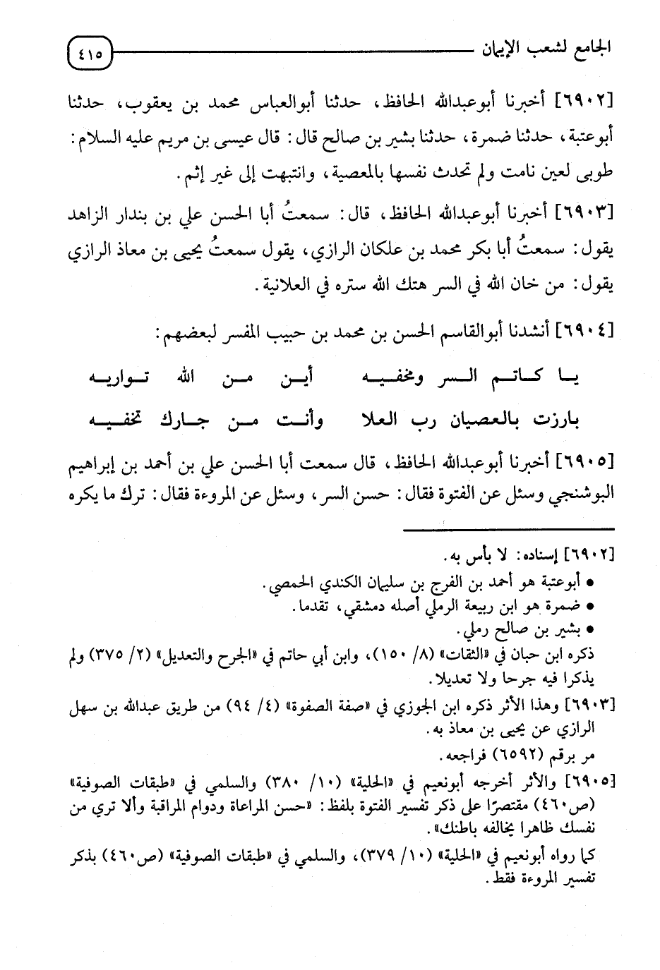 6903 - أَخْبَرَنَا أَبُو عَبْدِ اللهِ الْحَافِظُ، سَمِعْتُ أَبَا الْحُسَيْنِ عَلِيَّ بْنَ بُنْدَارٍ الزَّاهِدَ يَقُولُ: سَمِعْتُ أَبَا بَكْرٍ مُحَمَّدَ بْنَ مِلْكَانَ الرَّازِيَّ، سَمِعْتُ يَحْيَى بْنَ مُعَاذٍ الرَّازِيَّ يَقُولُ:" §مَنْ خَانَ اللهَ فِي السِّرِّ هَتَكَ سِرَّهُ فِي الْعَلَانِيَةِ"،