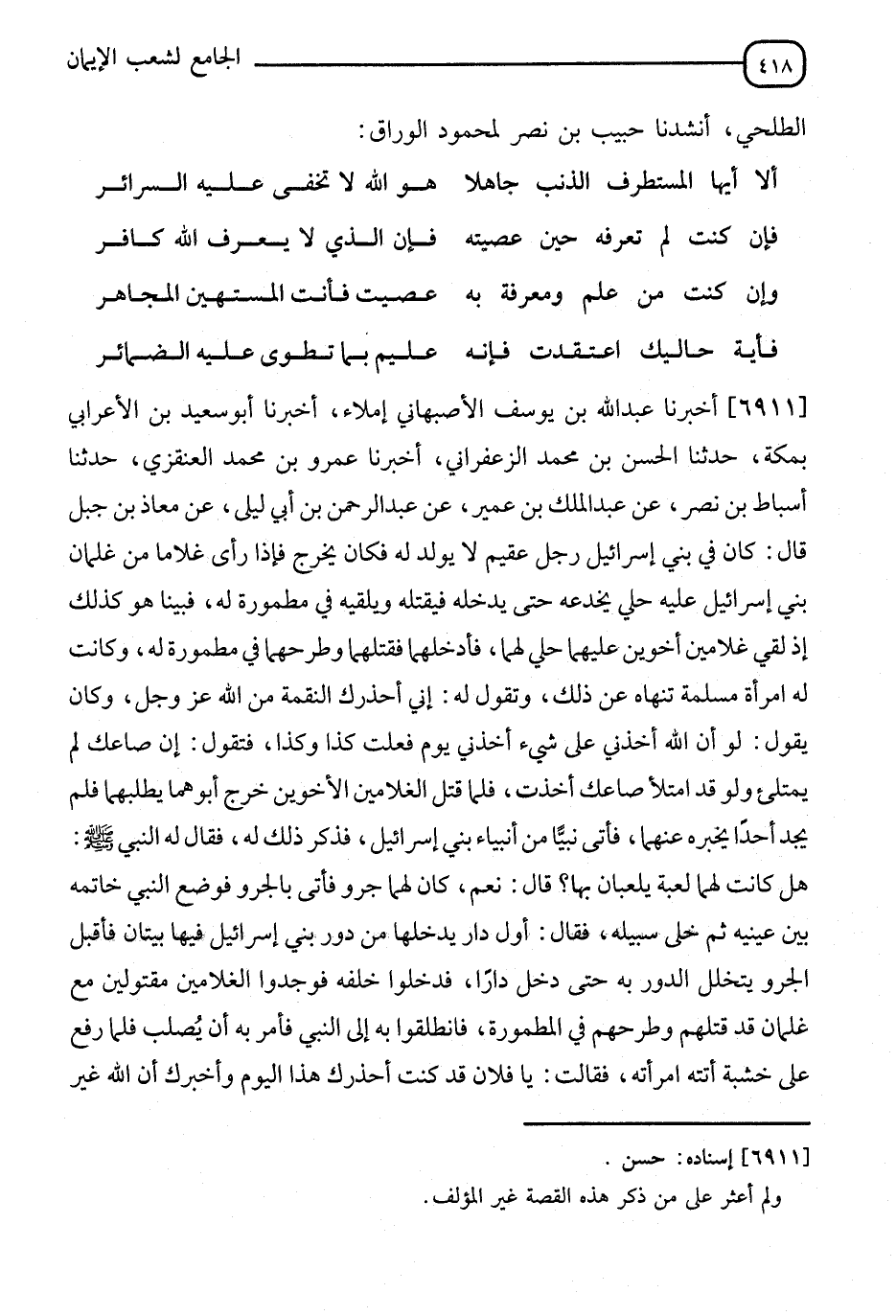 6911 - أَخْبَرَنَا عَبْدُ اللهِ بْنُ يُوسُفَ الْأَصْبَهَانِيُّ، إِمْلَاءً، أَنَا أَبُو سَعِيدِ بْنُ الْأَعْرَابِيِّ بِمَكَّةَ، نا الْحُسَيْنُ بْنُ مُحَمَّدٍ الزَّعْفَرَانِيُّ، أَنَا عَمْرُو بْنُ مُحَمَّدٍ الْعَنْقَزِيُّ، نا أَسْبَاطُ بْنُ نَصْرٍ، عَنْ عَبْدِ الْمَلِكِ بْنِ عُمَيْرٍ، عَنْ عَبْدِ الرَّحْمَنِ بْنِ أَبِي لَيْلَى، عَنْ مُعَاذِ بْنِ جَبَلٍ قَالَ: " كَانَ §فِي بَنِي إِسْرَائِيلَ رَجُلٌ عَقِيمٌ لَا يُولَدُ لَهُ، وَكَانَ يَخْرُجُ فَإِذَا رَأَى غُلَامًا مِنْ غِلْمَانِ بَنِي إِسْرَائِيلَ عَلَيْهِ حُلِيٌّ يَخْدَعُهُ حَتَّى يُدْخِلَهُ فَيَقْتُلُهُ وَيُلْقِيهِ فِي مَطْمُورَةٍ لَهُ، فَبَيْنَا هُوَ كَذَلِكَ إِذْ لَقِيَ غُلَامَيْنِ أَخَوَيْنِ عَلَيْهِمَا حُلِيٌّ لَهُمَا، فَأَدْخَلَهُمَا فَقَتَلَهُمَا وَطَرَحَهُمَا فِي مَطْمُورَةٍ لَهُ، وَكَانَتْ لَهُ امْرَأَةٌ مَسْلَمَةٌ تَنْهَاهُ عَنْ ذَلِكَ فَتَقُولُ لَهُ: إِنِّي أُحَذِّرُكَ النِّقْمَةَ مِنَ اللهِ عَزَّ وَجَلَّ، وَكَانَ يَقُولُ: لَوْ أَنَّ اللهَ أَخَذَنِي عَلَى شَيْءٍ أَخَذَنِي يَوْمَ فَعَلْتُ كَذَا وَكَذَا، فَتَقُولُ: إِنَّ صَاعَكَ لَمْ تَمْتَلِئْ بَعْدُ، وَلَوْ قَدِ امْتَلَأَ صَاعُكَ أُخِذْتَ، فَلَمَّا قَتَلَ الْغُلَامَيْنِ الْأَخَوَيْنِ خَرَجَ أَبُوهُمَا، فَطَلَبَهُمَا فَلَمْ يَجِدْ أَحَدًا يُخْبِرُهُ عَنْهُمَا، فَأَتَى نَبِيًّا مِنْ أَنْبِيَاءِ بَنِي إِسْرَائِيلَ فَذَكَرَ ذَلِكَ لَهُ، فَقَالَ لَهُ النَّبِيُّ: هَلْ كَانَتْ لَهُمَا لُعْبَةٌ يَلْعَبَانِ بِهَا؟ قَالَ: نَعَمْ، كَانَ لَهُمَا جَرْوٌ، فَأُتِيَ بِالْجَرْوِ فَوَضَعَ النَّبِيُّ خَاتَمَهُ بَيْنَ عَيْنَيْهِ، ثُمَّ خَلَّى سَبِيلَهُ فَقَالَ: أَوَّلُ دَارٍ يَدْخُلُهَا مِنْ بَنِي إِسْرَائِيلَ فِيهَا مَيِّتَانِ، فَأَقْبَلَ الْجَرْوُ يَتَخَلَّلُ الدُّورَ حَتَّى دَخَلَ دَارًا، فَدَخَلُوا خَلْفَهُ، فَوَجَدُوا الْغُلَامَيْنِ مَقْتُولَيْنِ مَعَ غُلَامٍ قَدْ قَتَلَهُ وَطَرَحَهُمْ فِي الْمَطْمُورَةِ، فَانْطَلَقُوا بِهِ إِلَى النَّبِيِّ فَأَمَرَ بِهِ أَنْ يُصْلَبَ، فَلَمَّا رُفِعَ عَلَى خَشَبَتِهِ أَتَتِ امْرَأَتُهُ فَقَالَتْ: يَا فُلَانُ قَدْ كُنْتُ أُحَذِّرُكَ هَذَا الْيَوْمَ، وَأُخْبِرُكَ أَنَّ اللهَ غَيْرُ -[419]- تَارِكِكَ وَأَنْتَ تَقُولُ: لَوْ أَنَّ اللهَ أَخَذَنِي عَلَى شَيْءٍ أَخَذَنِي يَوْمَ فَعَلْتُ كَذَا وَكَذَا، فَأُخْبِرُكَ أَنَّ صَاعَكَ بَعْدُ لَمْ تَمْتَلِئْ، أَلَا وَإِنَّ هَذَا قَدِ امْتَلَأَ صَاعُكَ "