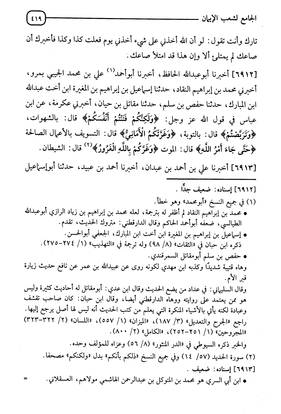 6912 - أَخْبَرَنَا أَبُو عَبْدِ اللهِ الْحَافِظُ، أَنَا أَبُو مُحَمَّدٍ عَلِيُّ بْنُ مُحَمَّدٍ الْحَبِيبِيُّ، بِمَرْوَ، وَأَخْبَرَنِي مُحَمَّدُ بْنُ إِبْرَاهِيمَ النَّقَّادُ، نا إِسْمَاعِيلُ بْنُ إِبْرَاهِيمَ بْنِ الْمُغِيرَةِ ابْنُ أُخْتِ عَبْدِ اللهِ بْنِ الْمُبَارَكِ، نا حَفْصُ بْنُ سَالِمٍ، نا مُقَاتِلُ بْنُ حَيَّانَ، أَخْبَرَنِي عِكْرِمَةُ، عَنِ ابْنِ عَبَّاسٍ: فِي قَوْلِ اللهِ عَزَّ وَجَلَّ: {§ذَلِكُمْ بِأَنَّكُمْ فَتَنْتُمْ أَنْفُسَكُمْ} قَالَ: " بِالشَّهَوَاتِ "، {وَتَرَبَّصْتُمْ} [الحديد: 14]، قَالَ: " بِالتَّوْبَةِ "، {وَغَرَّتْكُمُ الْأَمَانِيُّ} [الحديد: 14]، قَالَ: " التَّسْوِيفُ بِالْأَعْمَالِ الصَّالِحَةِ "، {حَتَّى جَاءَ أَمْرُ اللهِ} [الحديد: 14]، قَالَ: " الْمَوْتُ "، {وَغَرَّكُمْ بِاللهِ الْغُرُورِ} [الحديد: 14]، قَالَ: " الشَّيْطَانُ "