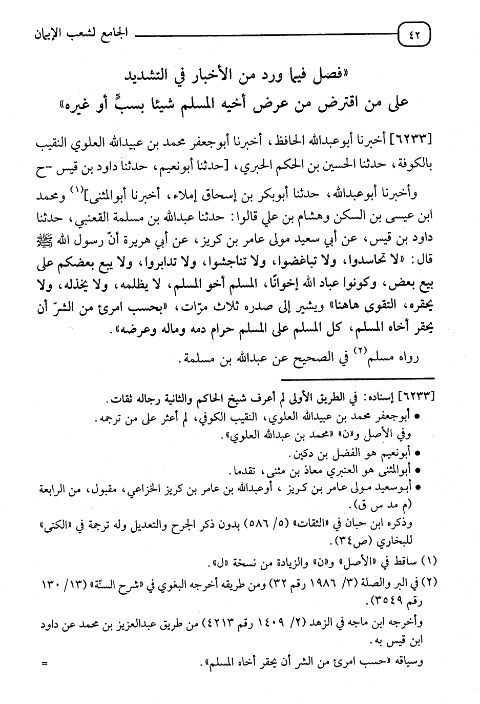 6233 - أَخْبَرَنَا أَبُو عَبْدِ اللهِ الْحَافِظُ، نا أَبُو جَعْفَرٍ مُحَمَّدُ بْنُ عَبْدِ اللهِ الْعَلَوِيُّ النَّقِيبُ بِالْكُوفَةِ، نا الْحُسَيْنُ بْنُ الْحَكَمِ الْحِيرِيُّ، وَمُحَمَّدُ بْنُ عِيسَى بْنِ السَّكَنِ، وَهِشَامُ بْنُ عَلِيٍّ، نا عَبْدُ اللهِ بْنُ مَسْلَمَةَ الْقَعْنَبِيُّ، نا دَاوُدُ بْنُ قَيْسٍ، عَنْ أَبِي سَعِيدٍ مَوْلَى عَامِرِ بْنِ كُرَيْزٍ، عَنْ أَبِي هُرَيْرَةَ، أَنَّ رَسُولَ اللهِ صَلَّى اللَّهُ عَلَيْهِ وَسَلَّمَ قَالَ: §" لَا تَحَاسَدُوا، وَلَا تَبَاغَضُوا، وَلَا تَنَاجَشُوا، وَلَا تَدَابَرُوا، وَلَا يَبِعْ بَعْضُكُمْ عَلَى بَيْعِ بَعْضٍ، وَكُونُوا عِبَادَ اللهِ إِخْوَانًا، الْمُسْلِمُ أَخُو الْمُسْلِمِ لَا يَظْلِمُهُ، وَلَا يَخْذُلُهُ، وَلَا يَحْقِرُهُ التَّقْوَى ههُنَا يُشِيرُ إِلَى صَدْرِهِ ثَلَاثَ مَرَّاتٍ بِحَسْبِ امْرِئٍ مِنَ الشَّرِّ أَنْ يَحْقِرَ أَخَاهُ الْمُسْلِمَ، كُلُّ الْمُسْلِمِ عَلَى الْمُسْلِمِ حَرَامٌ دَمُهُ وَمَالُهُ وَعِرْضُهُ " رَوَاهُ مُسْلِمٌ فِي الصَّحِيحِ، عَنْ عَبْدِ اللهِ بْنِ مَسْلَمَةَ