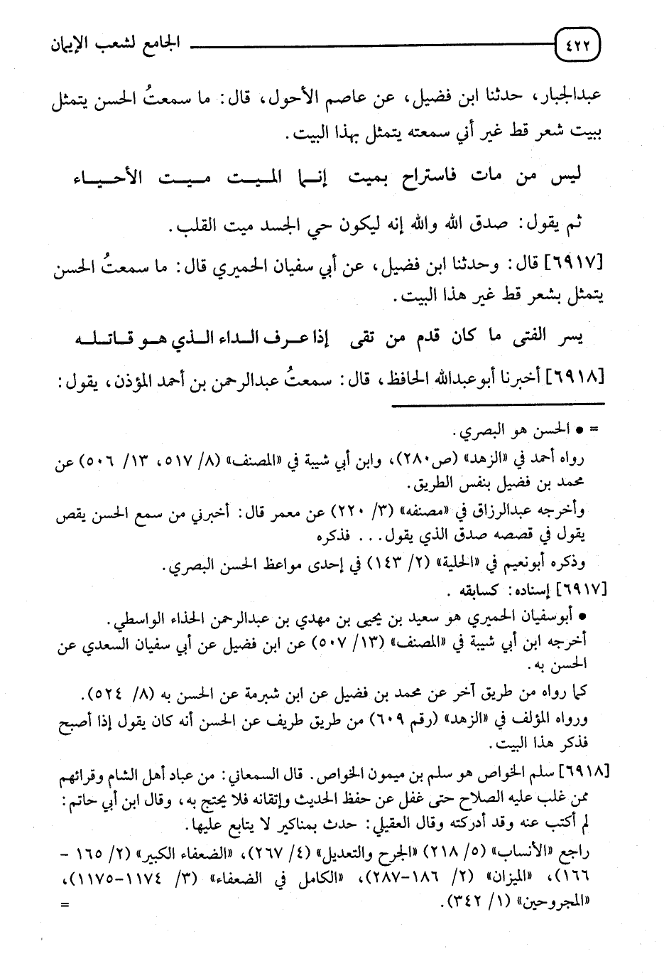 6917 - قَالَ: ونا ابْنُ فُضَيْلٍ، عَنْ أَبِي سُفْيَانَ الْحِمْيَرِيِّ قَالَ: مَا سَمِعْتُ الْحَسَنَ يَتَمَثَّلُ بِشِعْرٍ قَطُّ غَيْرِ هَذَا الْبَيْتِ: