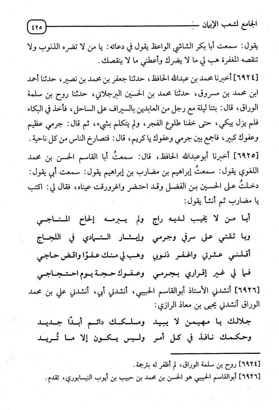 6926 - أَنْشَدَنَا الْأُسْتَاذُ أَبُو الْقَاسِمِ الْحَبِيصُ، أَنْشَدَنِي أَبِي، أَنْشَدَنِي عَلِيُّ بْنُ مُحَمَّدٍ الْوَرَّاقُ، أَنْشَدَنِي يَحْيَى بْنُ مُعَاذٍ الرَّازِيُّ:"