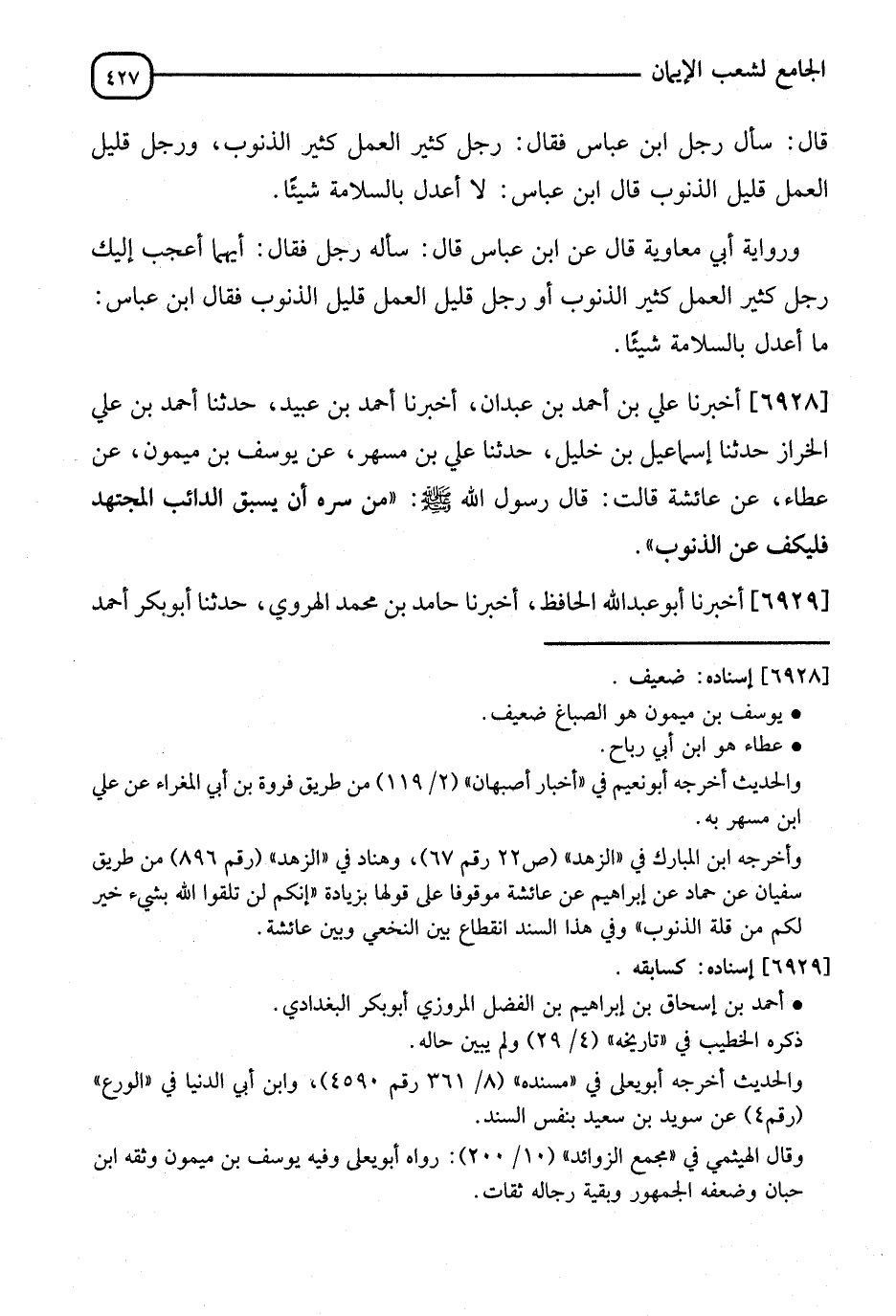 6928 - أَخْبَرَنَا عَلِيُّ بْنُ أَحْمَدَ بْنِ عَبْدَانَ، أَنَا أَحْمَدُ بْنُ عُبَيْدٍ، نا أَحْمَدُ بْنُ عَلِيٍّ الْخَزَّازُ، نا إِسْمَاعِيلُ بْنُ خليلاي، نا عَلِيُّ بْنُ مُسْهِرٍ، عَنْ يُوسُفَ بْنِ مَيْمُونٍ، عَنْ عَطَاءٍ، عَنْ عَائِشَةَ قَالَتْ: قَالَ رَسُولُ اللهِ صَلَّى اللَّهُ عَلَيْهِ وَسَلَّمَ: §" مَنْ سَرَّهُ أَنْ يَسْبِقَ الدَّائِبَ الْمُجْتَهِدَ فَلْيَكُفَّ عَنِ الذُّنُوبِ ".