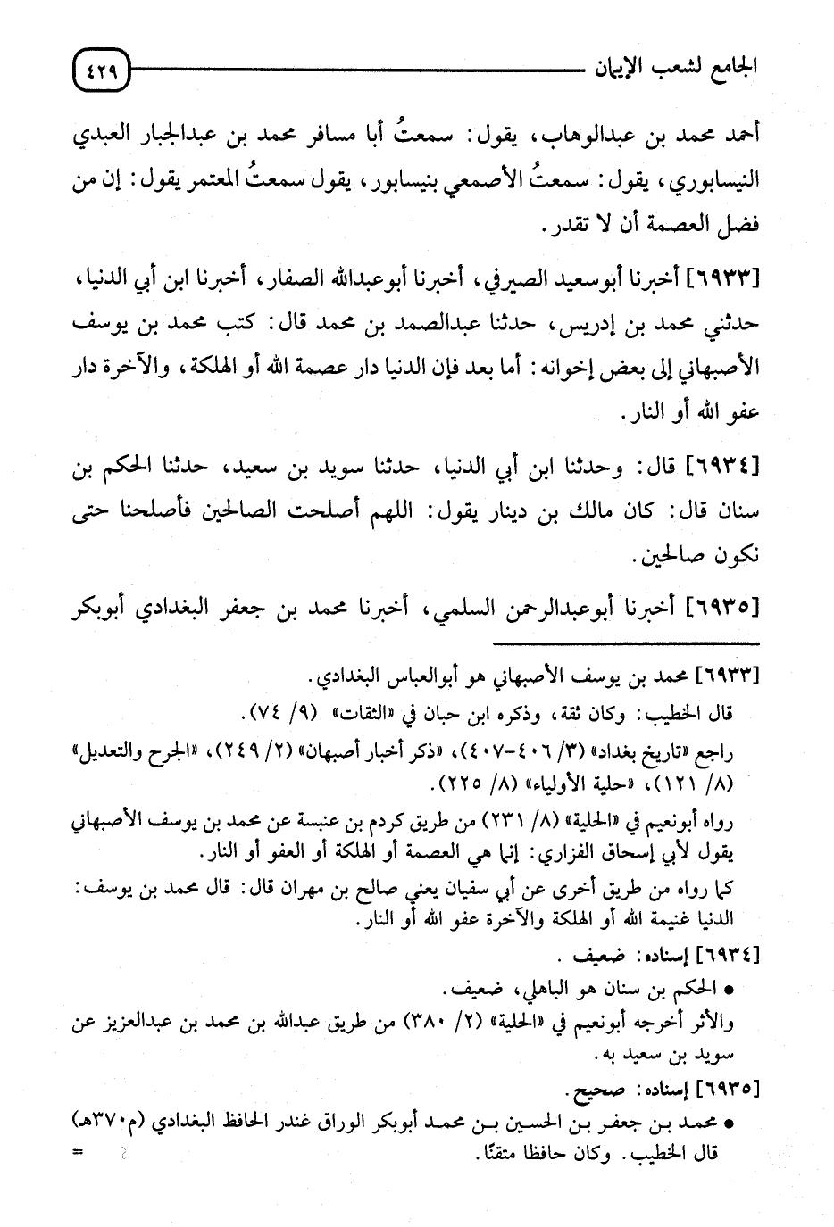 6933 - أَخْبَرَنَا أَبُو سَعِيدٍ الصَّيْرَفِيُّ، أَنَا أَبُو عَبْدِ اللهِ الصَّفَّارُ، نا ابْنُ أَبِي الدُّنْيَا، حَدَّثَنِي مُحَمَّدُ بْنُ إِدْرِيسَ، نا عَبْدُ الصَّمَدِ بْنُ مُحَمَّدٍ قَالَ: كَتَبَ مُحَمَّدُ بْنُ يُوسُفَ الْأَصْبَهَانِيُّ إِلَى بَعْضِ إِخْوَانِهِ: " أَمَّا بَعْدُ، فَإِنَّ §الدُّنْيَا دَارُ عِصْمَةِ اللهِ أَوِ الْهَلَكَةِ، وَالْآخِرَةُ دَارُ عَفْوِ اللهِ أَوِ النَّارِ "