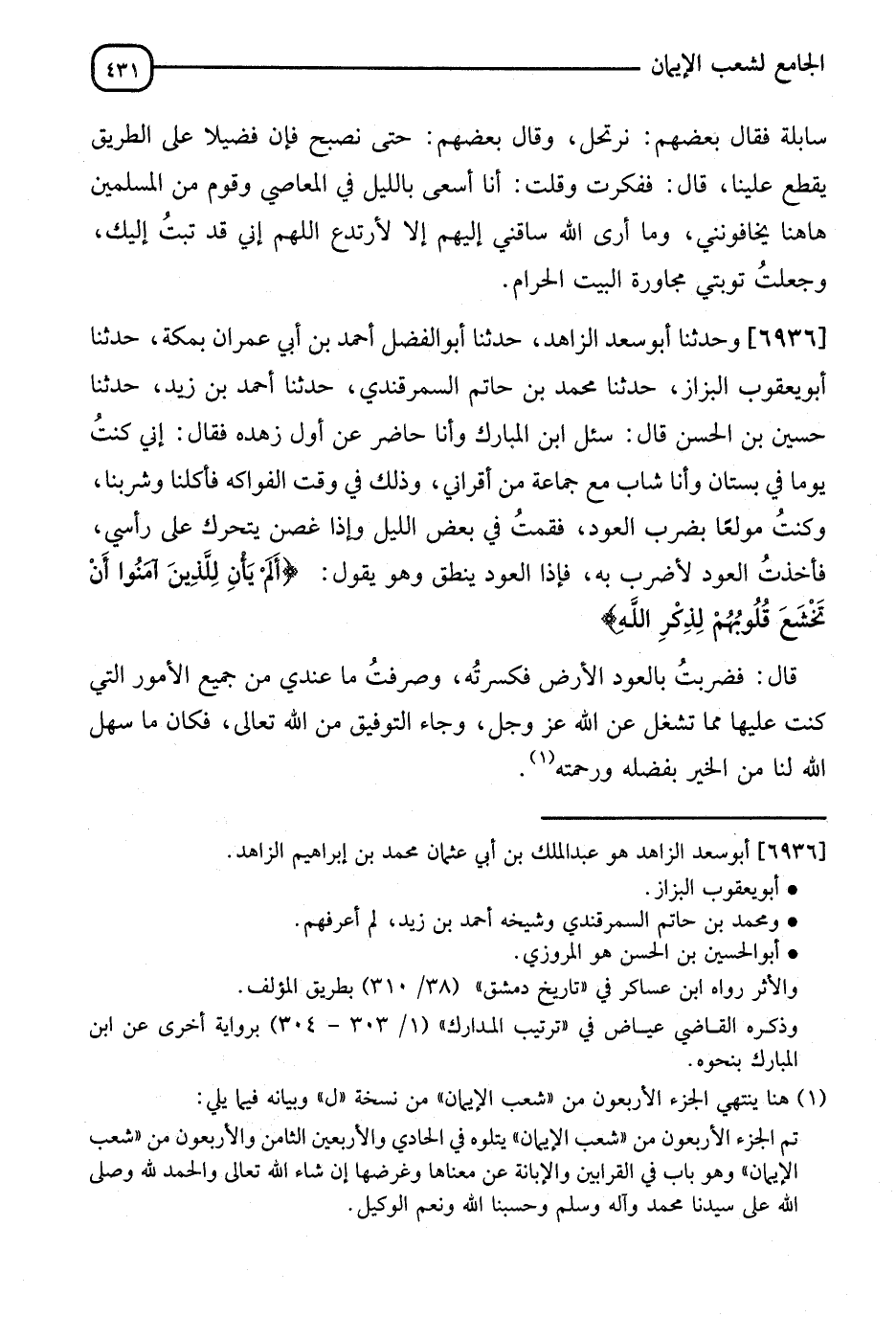 6936 - وَحَدَّثَنَا أَبُو سَعْدٍ الزَّاهِدُ، نا أَبُو الْفَضْلِ أَحْمَدُ بْنُ أَبِي عِمْرَانَ، بِمَكَّةَ، نا أَبُو يَعْقُوبٍ الْبَزَّارُ، نا مُحَمَّدُ بْنُ حَاتِمٍ السَّمَرْقَنْدِيُّ، نا أَحْمَدُ بْنُ زَيْدٍ، نا حُسَيْنُ بْنُ الْحَسَنِ قَالَ: سُئِلَ ابْنُ الْمُبَارَكِ: يَا أَبَا حَاضِرٍ عَنْ هَذِهِ، فَقَالَ: " إِنِّي §كُنْتُ يَوْمًا فِي بُسْتَانٍ وَأَنَا شَابٌّ مَعَ جَمَاعَةٍ مِنْ أَتْرَابِي، ذَلِكَ فِي وَقْتِ الْفَوَاكِهِ، فَأَكَلْنَا وَشَرِبْنَا، وَكُنْتُ مُولَعًا بِضَرْبِ الْعُودِ، فَقُمْتُ فِي بَعْضِ اللَّيْلِ، وَإِذَا بِغُصْنٍ يَتَحَرَّكُ عَلَى رَأْسِي، فَأَخَذْتُ الْعُودُ لِأَضْرِبَ بِهِ فَإِذَا أَنَا بِالْعُودِ يَنْطِقُ وَيَقُولُ: {أَلَمْ يَأْنِ لِلَّذِينَ آمَنُوا أَنْ تَخْشَعَ قُلُوبُهُمْ لِذِكْرِ اللهِ} [الحديد: 16]، قَالَ: فَضَرَبْتُ بِالْعُودِ الْأَرْضَ فَكَسَرْتُهُ، وَصَرَفْتُ مَا عِنْدِي مِنْ جَمِيعِ الْأُمُورِ الَّتِي كُنْتُ عَلَيْهَا مِمَّا تُشْغِلُ عَنِ اللهِ عَزَّ وَجَلَّ، وَجَاءَ التَّوْفِيقُ مِنَ اللهِ تَعَالَى، وَكَانَ مَا سَهَّلَ لَنَا مِنَ الْخَيْرِ بِفَضْلِهِ وَبِرَحْمَتِهِ " -[432]- الثَّامِنُ وَالْأَرْبَعُونَ مِنْ شُعَبِ الْإِيمَانِ وَهُوَ