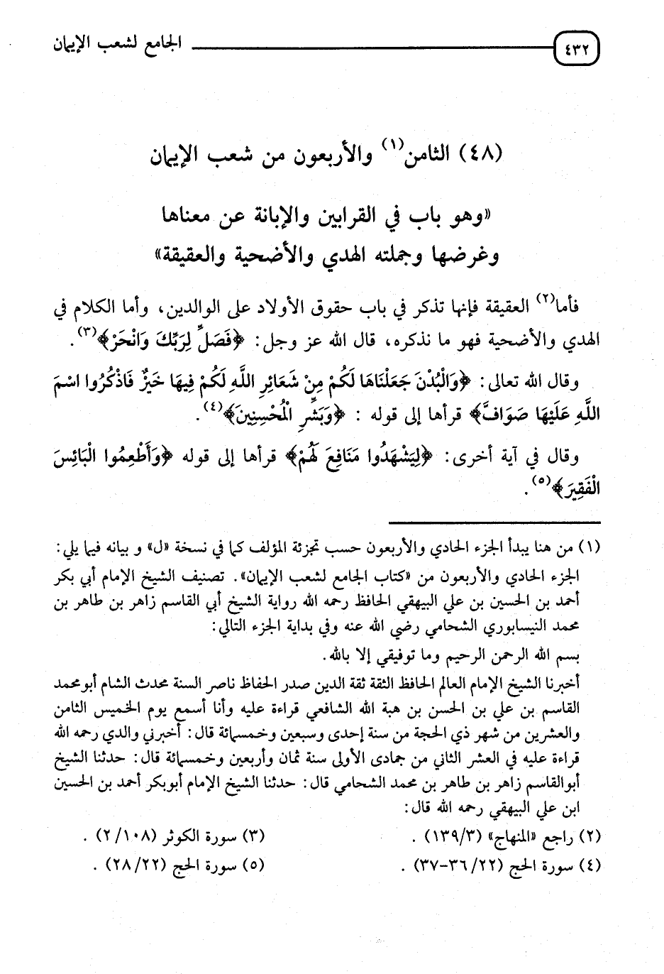 §بَابٌ فِي الْقَرَابِينَ وَالْأَمَانَةِ عَنْ مَعْنَاهَا وَعَرْضِهَا وَجُمْلَتِهِ الْهَدْيُ، وَالْأُضْحِيَةُ، وَالْعَقِيقَةُ، فَأَمَّا الْعَقِيقَةُ فَإِنَّهَا تُذْكَرُ فِي بَابِ حُقُوقِ الْأَوْلَادِ عَلَى الْوَالِدَيْنِ، وَأَمَّا الْكَلَامُ فِي الْهَدْيِ وَالْأُضْحِيَةِ فَهُوَ مَا نَذْكُرُهُ، قَالَ اللهُ عَزَّ وَجَلَّ: {فَصَلِّ لِرَبِّكَ وَانْحَرْ} [الكوثر: 2]، وَقَالَ: {وَالْبُدْنَ جَعَلْنَاهَا لَكُمْ مِنْ شَعَائِرِ اللهِ لَكُمْ فِيهَا خَيْرٌ فَاذْكُرُوا اسْمَ اللهِ عَلَيْهَا صَوَافَّ} [الحج: 36]، قَرَأَهَا إِلَى قَوْلِهِ: {وَبَشِّرِ الْمُحْسِنِينَ} [الحج: 37]، وَقَالَ فِي آيَةٍ أُخْرَى: {لِيَشْهَدُوا مَنَافِعَ لَهُمْ} [الحج: 28]، قَرَأَهَا إِلَى قَوْلِهِ: {وَأَطْعِمُوا الْبَائِسَ الْفَقِيرَ} [الحج: 28]،