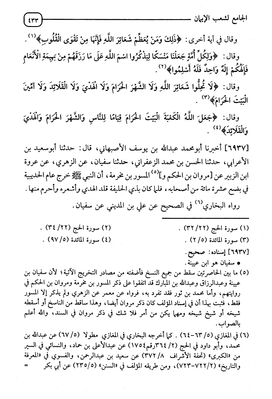 وَقَالَ فِي آيَةٍ أُخْرَى: {وَمَنْ يُعَظِّمْ شَعَائِرَ اللهِ فَإِنَّهَا مِنْ تَقْوَى الْقُلُوبِ} [الحج: 32]، وَقَالَ: {وَلِكُلِّ أُمَّةٍ جَعَلْنَا مَنْسَكًا لِيَذْكُرُوا اسْمَ اللهِ عَلَى مَا رَزَقَهُمْ مِنْ بَهِيمَةِ الْأَنْعَامِ فَإِلَهُكُمْ إِلَهٌ وَاحِدٌ فَلَهُ أَسْلِمُوا} [الحج: 34]، {لَا تُحِلُّوا شَعَائِرَ اللهِ وَلَا الشَّهْرَ الْحَرَامَ وَلَا الْهَدْيَ وَلَا الْقَلَائِدَ وَلَا آمِّينَ الْبَيْتَ الْحَرَامَ} [المائدة: 2]، وَقَالَ: {جَعَلَ اللهُ الْكَعْبَةَ الْبَيْتَ الْحَرَامَ قِيَامًا لِلنَّاسِ وَالشَّهْرَ الْحَرَامَ وَالْهَدْيَ وَالْقَلَائِدَ} [المائدة: 97]
