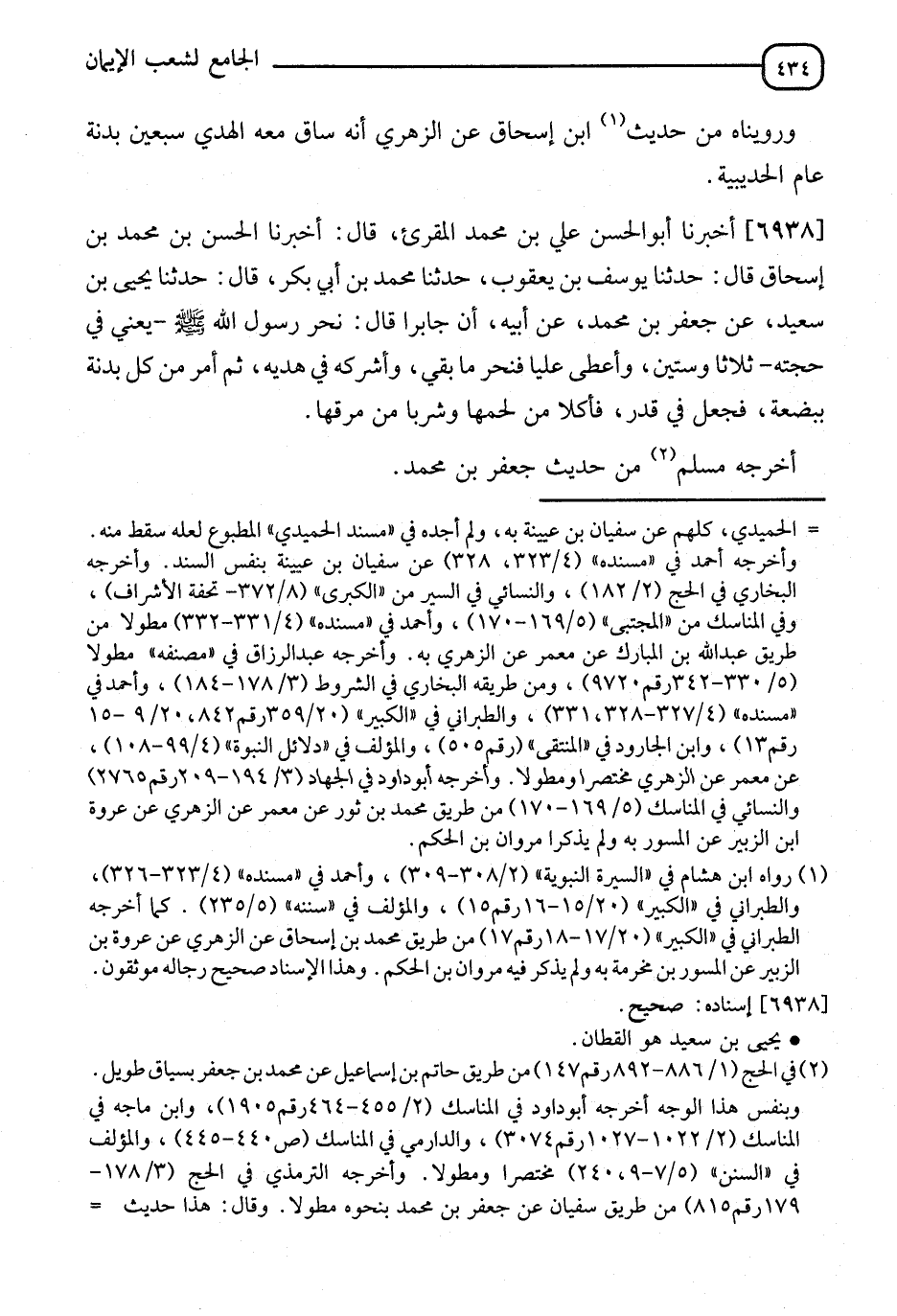 6938 - أَخْبَرَنَا أَبُو الْحُسَيْنِ عَلِيُّ بْنُ مُحَمَّدٍ الْمُقْرِئُ، أَنَا الْحَسَنُ بْنُ مُحَمَّدِ بْنِ إِسْحَاقَ، نا يُوسُفُ بْنُ يَعْقُوبَ، نا مُحَمَّدُ بْنُ أَبِي بَكْرٍ، نا يَحْيَى بْنُ سَعِيدٍ، عَنْ جَعْفَرِ بْنِ مُحَمَّدٍ، عَنْ أَبِيهِ: أَنَّ جَابِرًا قَالَ: " §نَحَرَ رَسُولُ اللهِ صَلَّى اللَّهُ عَلَيْهِ وَسَلَّمَ، يَعْنِي فِي حَجَّتِهِ ثَلَاثًا وَسِتِّينَ، وَأَعْطَى عَلِيًّا فَنَحَرَ مَا بَقِيَ وَأَشْرَكَهُ فِي هَدْيِهِ، ثُمَّ أَمَرَ مِنْ كُلِّ بَدَنَةٍ بِبَضْعَةٍ، فَجُعِلَ فِي قِدْرٍ فَأَكَلَا مِنْ لَحْمِهَا وَشَرِبَا مِنْ مَرَقِهَا " أَخْرَجَهُ مُسْلِمٌ مِنْ حَدِيثِ جَعْفَرِ بْنِ مُحَمَّدٍ