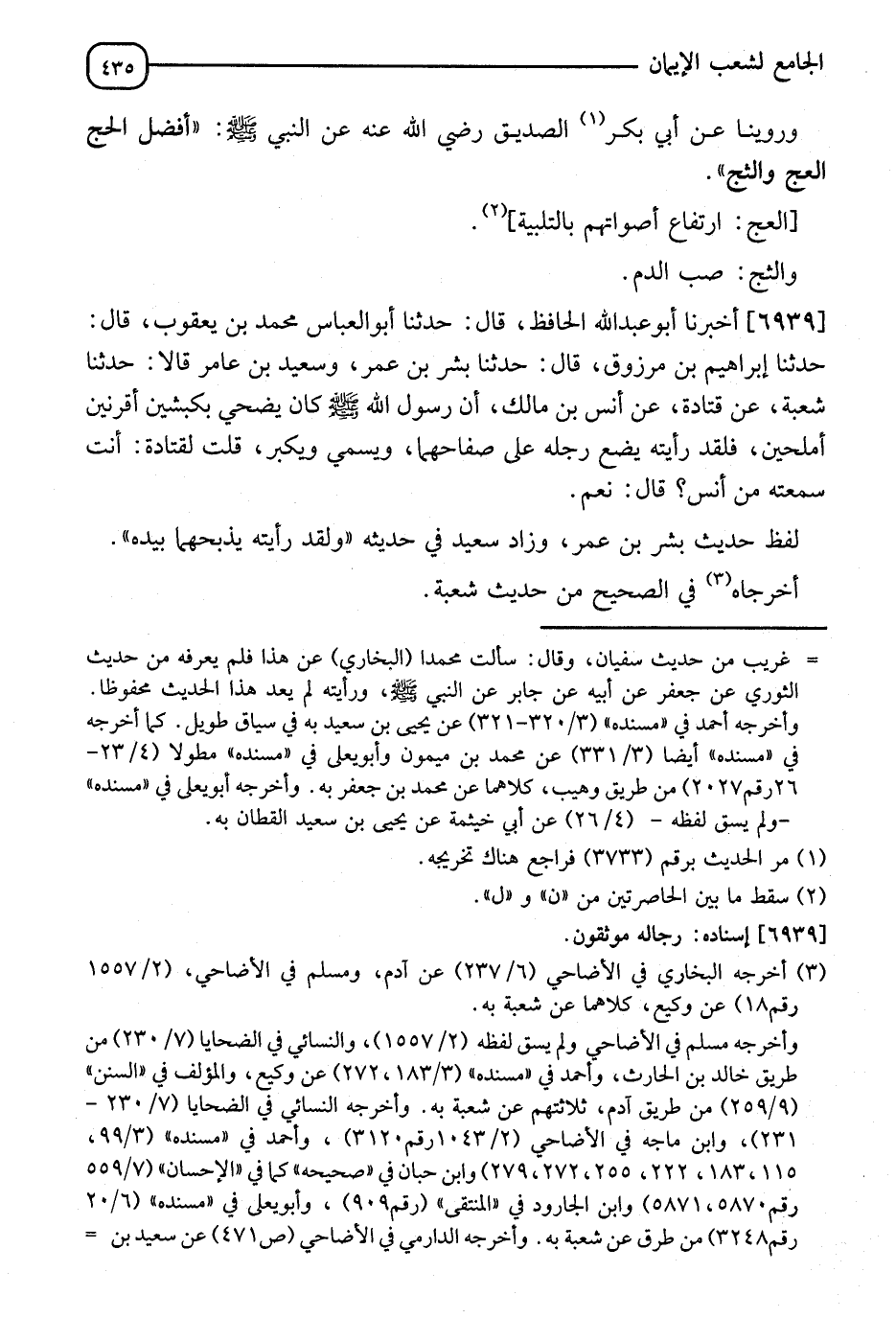 6939 - أَخْبَرَنَا أَبُو عَبْدِ اللهِ الْحَافِظُ، نا أَبُو الْعَبَّاسِ مُحَمَّدُ بْنُ يَعْقُوبَ، نا إِبْرَاهِيمُ بْنُ مَرْزُوقٍ، نا بِشْرُ بْنُ عُمَرَ، وَسَعِيدُ بْنُ عَامِرٍ، قَالَا: ثنا شُعْبَةُ، عَنْ قَتَادَةَ، عَنْ أَنَسِ بْنِ مَالِكٍ: " أَنَّ رَسُولَ اللهِ صَلَّى اللَّهُ عَلَيْهِ وَسَلَّمَ كَانَ §يُضَحِّي بِكَبْشَيْنِ أَقْرَنَيْنِ أَمْلَحَيْنِ، فَلَقَدْ رَأَيْتُهُ يَضَعُ رِجْلَهُ عَلَى صِفَاحِهِمَا وَيُسَمِّي وَيُكَبِّرُ ". قُلْتُ لِقَتَادَةَ: لَأَنْتَ سَمِعْتَهُ مِنْ أَنَسٍ؟، قَالَ: نَعَمْ، لَفْظُ حَدِيثِ بِشْرِ بْنِ عُمَرَ، وَزَادَ سَعِيدٌ فِي حَدِيثِهِ: وَلَقَدْ رَأَيْتُهُ يَذْبَحُهُمَا بِيَدِهِ، أَخْرِجَاهُ فِي الصَّحِيحِ مِنْ حَدِيثِ شُعْبَةَ
