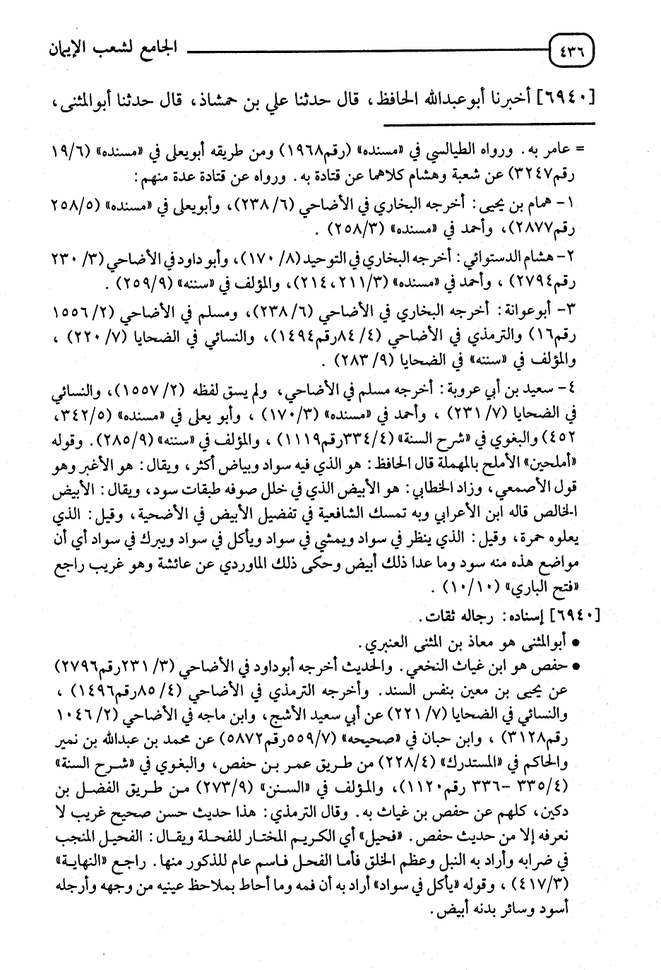 6940 - أَخْبَرَنَا أَبُو عَبْدِ اللهِ الْحَافِظُ، نا عَلِيُّ بْنُ حَمْشَاذَ أَبُو الْمُتَنَبِّي، -[437]- نا يَحْيَى بْنُ مَعِينٍ، نا حَفْصٌ، عَنْ جَعْفَرِ بْنِ مُحَمَّدٍ، عَنْ أَبِيهِ، عَنْ أَبِي سَعِيدٍ قَالَ: §" ضَحَّى رَسُولُ اللهِ صَلَّى اللَّهُ عَلَيْهِ وَسَلَّمَ بِكَبْشٍ أَقْرَنَ، فَجَعَلَ يَأْكُلُ فِي سَوَادٍ، وَيَمْشِي فِي سَوَادٍ، وَيَنْظُرُ فِي سَوَادٍ "