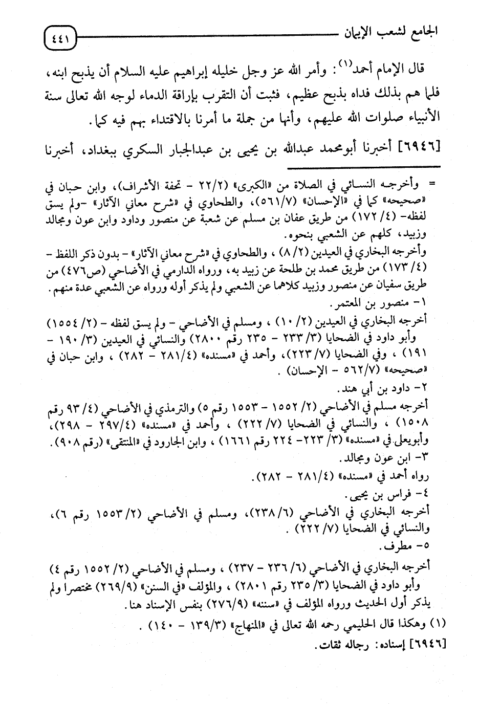 6946 - أَخْبَرَنَا أَبُو مُحَمَّدٍ عَبْدُ اللهِ بْنُ يَحْيَى بْنِ عَبْدِ الْجَبَّارِ السُّكَّرِيُّ، بِبَغْدَادَ، أَنَا -[442]- إِسْمَاعِيلُ بْنُ مُحَمَّدٍ الصَّفَّارُ، نا أَحْمَدُ بْنُ مَنْصُورٍ، نا عَبْدُ الرَّزَّاقِ، أَنَا مَعْمَرٌ، عَنِ الزُّهْرِيِّ، فِي قَوْلِهِ: {إِنِّي أَرَى فِي الْمَنَامِ أَنِّي أَذْبَحُكَ} [الصافات: 102]، قَالَ: أَخْبَرَنِي الْقَاسِمُ بْنُ مُحَمَّدٍ قَالَ: اجْتَمَعَ أَبُو هُرَيْرَةَ وَكَعْبٌ، فَجَعَلَ أَبُو هُرَيْرَةَ يُحَدِّثُ عَنِ النَّبِيِّ صَلَّى اللَّهُ عَلَيْهِ وَسَلَّمَ، وَجَعَلَ يُحَدِّثُ كَعْبٌ عَنِ الْكُتُبِ، فَقَالَ أَبُو هُرَيْرَةَ: قَالَ النَّبِيُّ صَلَّى اللَّهُ عَلَيْهِ وَسَلَّمَ: " إِنَّ §لِكُلِّ نَبِيٍّ دَعْوَةً مُسْتَجَابَةً، وَإِنِّي خَبَأْتُ دَعْوَتِي شَفَاعَةً لِأُمَّتِي يَوْمَ الْقِيَامَةِ ". فَقَالَ لَهُ كَعْبٌ: أَنْتَ سَمِعْتَ هَذَا مِنْ رَسُولِ اللهِ صَلَّى اللَّهُ عَلَيْهِ وَسَلَّمَ؟، قَالَ: نَعَمْ، قَالَ: فِدَاهُ أَبِي وَأُمِّي، أَوَلَا أُخْبِرُكَ عَنْ إِبْرَاهِيمَ عَلَيْهِ السَّلَامُ أَنَّهُ لَمَّا أُرِيَ ذَبْحَ ابْنِهِ إِسْحَاقَ قَالَ الشَّيْطَانُ: إِنْ لَمْ أَفْتِنْ هَؤُلَاءِ عِنْدَ هَذِهِ لَمْ أَفْتِنْهُمْ أَبَدًا، فَخَرَجَ إِبْرَاهِيمُ بِابْنِهِ لِيَذْبَحَهُ، فَذَهَبَ الشَّيْطَانُ فَدَخَلَ عَلَى سَارَةَ، فَقَالَ: أَيْنَ يَذْهَبُ إِبْرَاهِيمُ بِابْنِكِ؟، قَالَتْ: غَدَا بِهِ لِبَعْضِ حَاجَتِهِ، فَقَالَ: إِنَّهُ لَمْ يَغْدُ بِهِ لِحَاجَةٍ، إِنَّمَا ذَهَبَ بِهِ لِيَذْبَحَهُ، قَالَتْ: وَلِمَ يَذْبَحُهُ؟، قَالَ: يَزْعُمُ أَنَّ رَبَّهُ أَمَرَهُ بِذَلِكَ، قَالَتْ: فَقَدْ أَحْسَنَ أَنْ يُطِيعَ رَبَّهُ، فَخَرَجَ الشَّيْطَانُ فِي أَثَرِهِمَا فَقَالَ لِلْغُلَامِ: أَيْنَ يَذْهَبُ بِكَ أَبُوكَ؟ قَالَ: لِبَعْضِ حَاجَتِهِ قَالَ: إِنَّهُ لَا يَذْهَبُ بِكَ لِحَاجَةٍ، وَلَكِنَّهُ يَذْهَبُ بِكَ لِيَذْبَحَكَ قَالَ: لِمَ يَذْبَحُنِي؟ قَالَ: يَزْعُمُ أَنَّ رَبَّهُ أَمَرَهُ بِذَلِكَ قَالَ: فَوَاللهِ لَئِنْ كَانَ أَمَرَهُ بِذَلِكَ لَيَفْعَلَنَّ قَالَ: فَيَئِسَ مِنْهُ فَتَرَكَهُ، وَلَحِقَ بِإِبْرَاهِيمَ فَقَالَ: أَيْنَ عَدَوْتَ بِابْنِكِ؟ قَالَ: لِحَاجَةٍ قَالَ: فَإِنَّكَ لَمْ تَغْدُ بِهِ لِحَاجَةٍ، إِنَّمَا -[443]- غَدَوْتَ بِهِ لِتَذْبَحَهُ قَالَ: وَلِمَ أَذْبَحُهُ؟ قَالَ: تَزْعُمُ أَنَّ رَبَّكَ أَمَرَكَ بِذَلِكَ قَالَ: فَوَاللهِ لَئِنْ كَانَ اللهُ أَمَرَنِي بِذَلِكَ لَأَفْعَلَنَّ قَالَ: فَتَرَكَهُ وَيَئِسَ أَنْ يُطَاعَ قَالَ: {فَلَمَّا أَسْلَمَا وَتَلَّهُ لِلْجَبِينِ وَنَادَيْنَاهُ أَنْ يَا إِبْرَاهِيمُ قَدْ صَدَّقْتَ الرُّؤْيَا إِنَّا كَذَلِكَ نَجْزِي الْمُحْسِنِينَ} [الصافات: 104] قَالَ: فَأَوْحَى إِلَى إِسْحَاقَ أَنِ ادْعُ، فَإِنَّ لَكَ دَعْوَةً مُسْتَجَابَةً قَالَ إِسْحَاقُ: اللهُمَّ إِنِّي أَدْعُوكَ أَنْ تَسْتَجِيبَ لِي، أَيُّمَا عَبْدٍ لَقِيَكَ مِنَ الْأَوَّلِينَ وَالْآخِرِينَ، لَقِيَكَ لَا يُشْرِكُ بِكَ شَيْئًا أَنْ تُدْخِلَهُ الْجَنَّةَ " قَالَ الْحَلِيمِيُّ رَحِمَهُ اللهُ: " وَالْمَعْنَى فِي ذَلِكَ، وَاللهُ أَعْلَمُ، أَنَّ مَنْ حَجَّ وَاعْتَقَدَ فِي حَجِّهِ مَا قَدَّمْنَا ذِكْرَهُ فِي بَابِهِ مِنْ أَنَّهُ قَدِ انْسَلَخَ مِنْ زِينَةِ الدُّنْيَا وَشَهَوَاتِهَا، وَخَلَّفَهَا وَرَاءَ ظَهْرِهِ، وَتَابَ مِنَ الذُّنُوبِ، وَطَهَّرَ مِنْهَا قَلْبَهُ، وَجَاءَ مُعْتَذِرًا مُتَنَصِّلًا مُنِيبًا إِلَى رَبِّهِ، أُمِرَ أَنْ يُقَرِّبَ بِذَلِكَ قُرْبَانًا يُقَرِّبُهُ لَهُ مِنْ بَعْضِ مَا أُحِلَّ لَهُ مِنْ بَهِيمَةِ الْأَنْعَامِ، حَتَّى إِذَا رَمَى أَتْبَعَهُ نَحْرَهُ أَوْ ذَبْحَهُ، وَكَانَ كَأَنَّهُ يَقُولُ: اللهُمَّ إِنِّي قَدْ أَتَيْتُ مِنَ ال