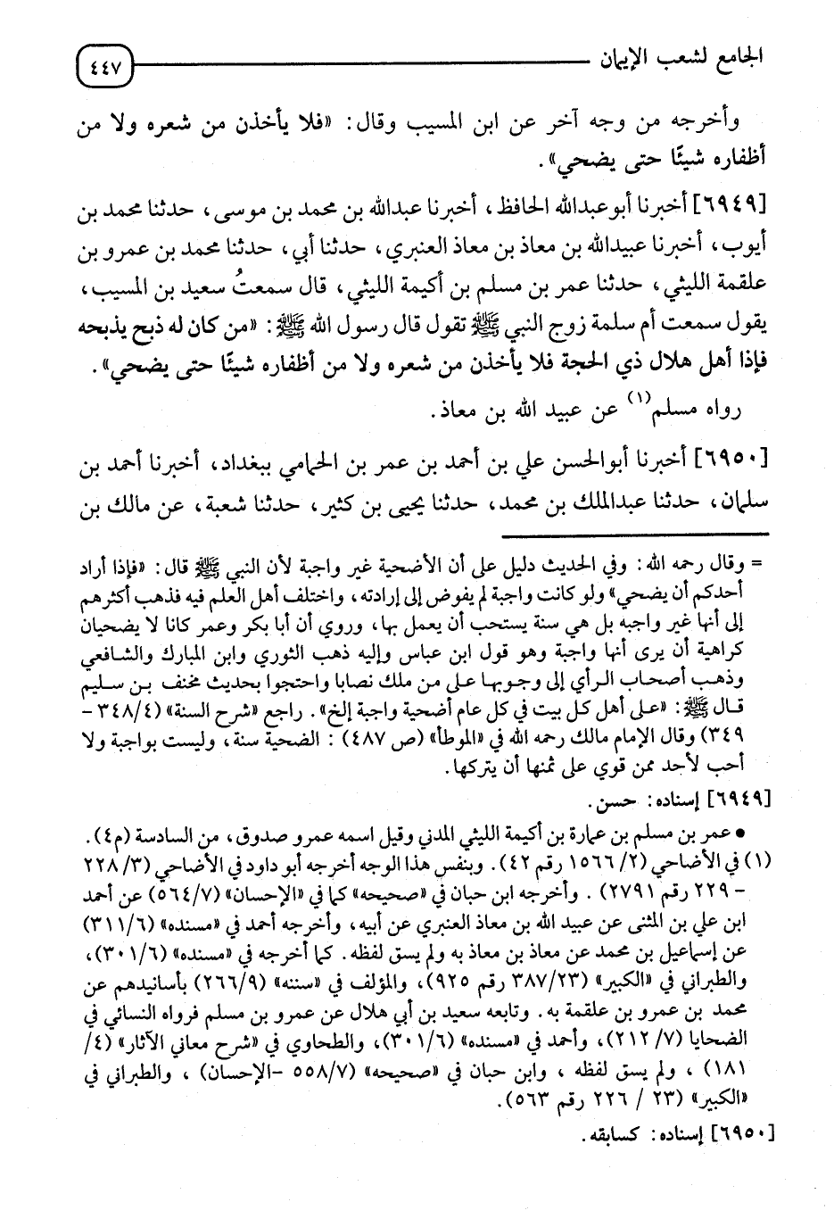 6949 - أَخْبَرَنَاهُ أَبُو عَبْدِ اللهِ الْحَافِظُ، أَنا عَبْدُ اللهِ بْنُ مُحَمَّدِ بْنِ مُوسَى، نا مُحَمَّدُ بْنُ أَيُّوبَ، أَنَا عُبَيْدُ اللهِ بْنُ مُعَاذِ بْنِ مُعَاذٍ الْعَنْبَرِيُّ، نا أَبِي، نا مُحَمَّدُ بْنُ عَمْرِو بْنِ عَلْقَمَةَ اللَّيْثِيُّ، نا عُمَرُ بْنُ مُسْلِمِ بْنِ أُكَيْمَةَ اللَّيْثِيُّ قَالَ: سَمِعْتُ سَعِيدَ بْنَ الْمُسَيِّبِ يَقُولُ: سَمِعْتُ أُمَّ سَلَمَةَ، زَوْجَ النَّبِيِّ صَلَّى اللَّهُ عَلَيْهِ وَسَلَّمَ تَقُولُ: قَالَ رَسُولُ اللهِ صَلَّى اللَّهُ عَلَيْهِ وَسَلَّمَ: §" مَنْ كَانَ لَهُ ذِبْحٌ يَذْبَحُهُ فَإِذَا أَهَلَّ هِلَالُ ذِي الْحِجَّةِ، فَلَا يَأْخُذَنَّ مِنْ شَعْرِهِ وَلَا مِنْ أَظْفَارِهِ شَيْئًا حَتَّى يُضَحِّيَ " رَوَاهُ مُسْلِمٌ، عَنْ عُبَيْدِ اللهِ بْنِ مُعَاذٍ