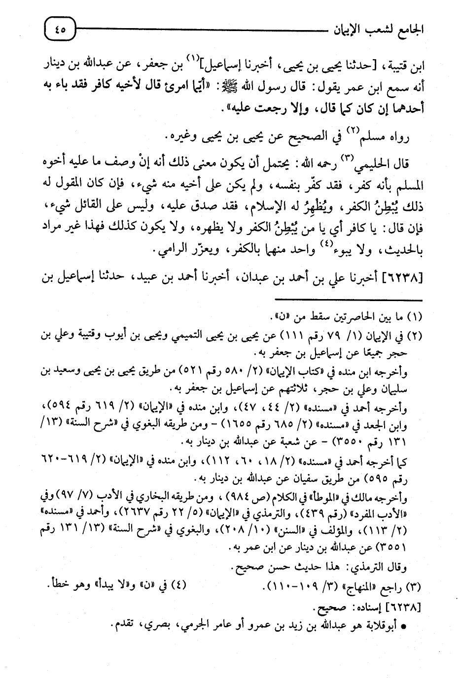 6238 - أَخْبَرَنَا عَلِيُّ بْنُ أَحْمَدَ بْنِ عَبْدَانَ، أَنَا أَحْمَدُ بْنُ عُبَيْدٍ، نا إِسْمَاعِيلُ بْنُ -[46]- إِسْحَاقَ الْقَاضِي، نا إِبْرَاهِيمُ بْنُ الْحَجَّاجِ، نا وهَيْبٌ، عَنْ أَبِي قِلَابَةَ، عَنْ ثَابِتِ بْنِ الضَّحَّاكِ، عَنِ النَّبِيِّ صَلَّى اللَّهُ عَلَيْهِ وَسَلَّمَ، قَالَ: " §مَنْ حَلَفَ بِمِلَّةٍ غَيْرِ الْإِسْلَامِ كَاذِبًا فَهُوَ كَمَا قَالَ، وَمَنْ قَتَلَ نَفْسَهُ بِشَيْءٍ عُذِّبَ بِهِ فِي نَارِ جَهَنَّمَ وَلَعْنُ الْمُؤْمِنِ كَقَتْلِهِ، وَمَنْ رَمَى مُؤْمِنًا بِكُفْرٍ فَهُوَ كَقَتْلِهِ ". رَوَاهُ الْبُخَارِيُّ فِي الصَّحِيحِ، عَنْ مُعَلَّى بْنِ أَسَدٍ، عَنْ وَهْبٍ. وَأَخْرَجَهُ مُسْلِمٌ مِنْ وَجْهٍ آخَرَ، عَنْ أَيُّوبَ