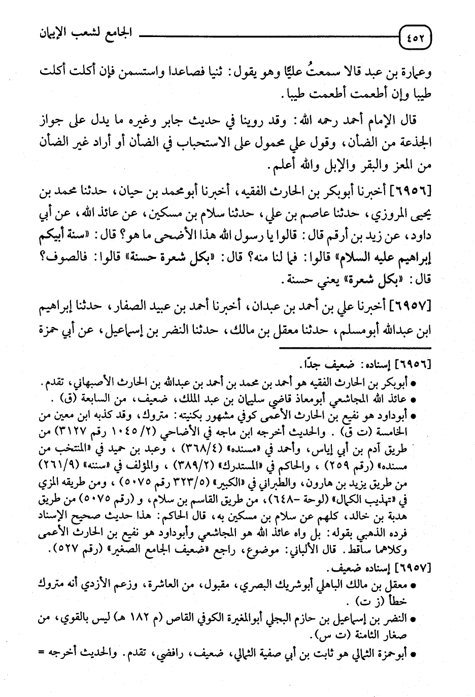 6957 - أَخْبَرَنَا عَلِيُّ بْنُ أَحْمَدَ بْنِ عَبْدَانَ، أَنَا أَحْمَدُ بْنُ عُبَيْدِ الصَّفَّارُ، نا إِبْرَاهِيمُ بْنُ عَبْدِ اللهِ أَبُو مُسْلِمٍ، نا مَعْقِلُ بْنُ مَالِكٍ، عَنِ النَّضْرِ بْنِ إِسْمَاعِيلَ، عَنْ أَبِي حَمْزَةَ -[453]- الثُّمَالِيُّ، عَنْ سَعِيدِ بْنِ جُبَيْرٍ، عَنْ عِمْرَانَ بْنِ حُصَينٍ قَالَ: قَالَ رَسُولُ اللهِ صَلَّى اللَّهُ عَلَيْهِ وَسَلَّمَ: " يَا فَاطِمَةُ §قَوْمِي فَاشْهَدِي أُضْحِيَتَكَ، فَإِنَّهُ يَغْفِرُ لَكِ بِأَوَّلِ قَطْرَةٍ تَقْطُرُ مِنْ دَمِهَا كُلَّ ذَنْبٍ عَمِلْتِيهِ، وَقُولِي: إِنَّ صَلَاتِي وَنُسُكِي وَمَحْيَايَ وَمَمَاتِي لِلَّهِ رَبِّ الْعَالَمِينَ لَا شَرِيكَ لَهُ وَبِذَلِكَ أُمِرْتُ وَأَنَا مِنَ الْمُسْلِمِينَ "، قُلْتُ: يَا رَسُولَ اللهِ هَذَا لَكَ وَلِأَهْلِ بَيْتِكَ خَاصَّةً، فَأَهْلُ ذَلِكَ أَنْتُمْ، أَمْ لِلْمُسْلِمِينَ عَامَّةً؟، قَالَ: " بَلْ لِلْمُسْلِمِينَ عَامَّةً ". قَالَ الْإِمَامُ أَحْمَدُ رَحِمَهُ اللهُ: " هَذَا وَالَّذِي قَبْلَهُ وَالْأَحَادِيثُ الْأَرْبَعَةُ الَّتِي قَبْلَهُ وَقَبْلَ أَثَرِ عَلِيٍّ رَضِيَ اللهُ عَنْهُ فِي أَسَانِيدِهَا مَقَالٌ، غَيْرَ أَنِّي رَأَيْتُ بَعْضَ عُلَمَائِنَا يَذْكُرُ أَمْثَالَهَا فِي فَضَائِلِ الْأَعْمَالِ، وَاللهُ يَعْصِمُنَا مِنَ الزَّلَلِ وَالْوَبَالِ "