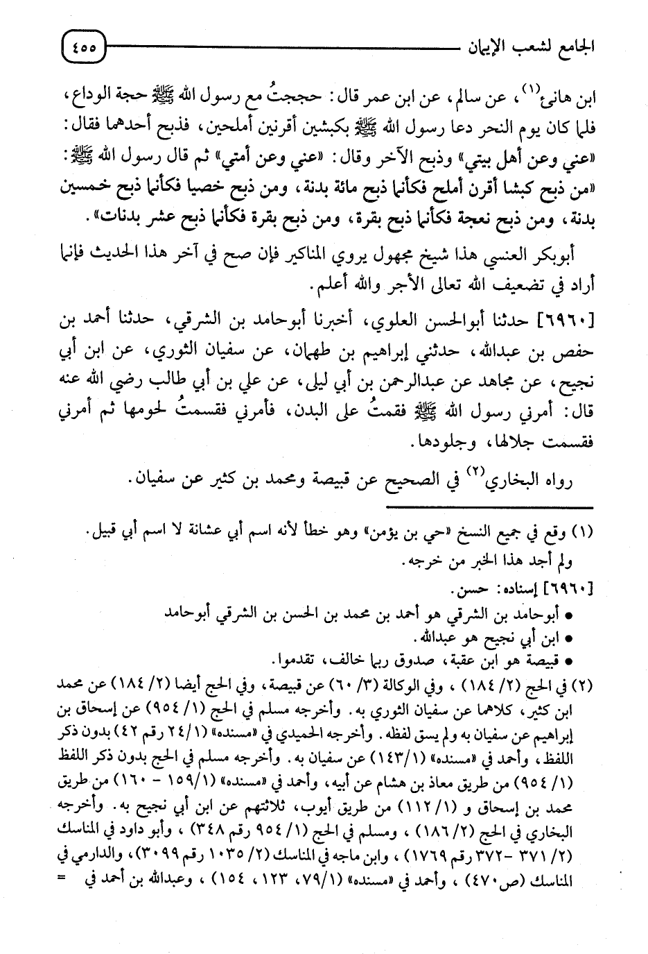 6960 - حَدَّثَنَا أَبُو الْحَسَنِ الْعَلَوِيُّ، أَنَا أَبُو حَامِدِ بْنُ الشَّرْقِيِّ، نا أَحْمَدُ بْنُ حَفْصِ بْنِ عَبْدِ اللهِ، حَدَّثَنِي أَبِي، حَدَّثَنِي إِبْرَاهِيمُ بْنُ طَهْمَانَ، عَنْ سُفْيَانَ الثَّوْرِيِّ، عَنِ ابْنِ أَبِي نَجِيحٍ، عَنْ مُجَاهِدٍ، عَنْ عَبْدِ الرَّحْمَنِ بْنِ أَبِي لَيْلَى، عَنْ عَلِيِّ بْنِ أَبِي طَالِبٍ قَالَ: §" أَمَرَنِي رَسُولُ اللهِ صَلَّى اللَّهُ عَلَيْهِ وَسَلَّمَ فَقُمْتُ عَلَى الْبُدْنِ، فَأَمَرَنِي فَقَسَمْتُ لَحْمَهَا، ثُمَّ أَمَرَنِي فَقَسَمْتُ جِلَالَهَا وَجُلُودَهَا " رَوَاهُ الْبُخَارِيُّ فِي الصَّحِيحِ، عَنْ قَبِيصَةَ، وَمُحَمَّدِ بْنِ كَثِيرٍ، عَنْ سُفْيَانَ