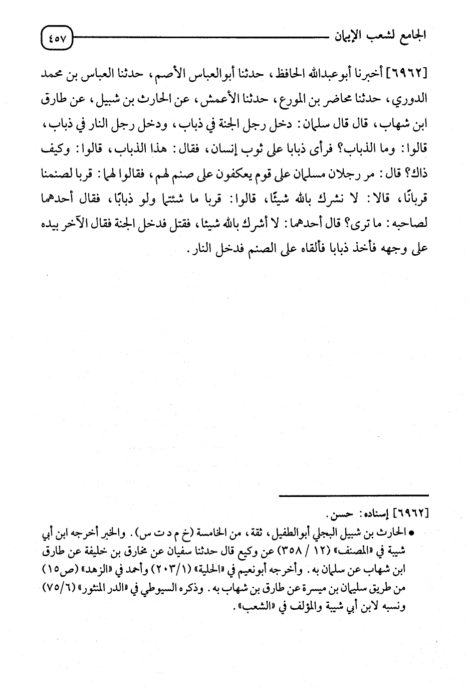 6962 - أَخْبَرَنَا أَبُو عَبْدِ اللهِ الْحَافِظُ، نا أَبُو الْعَبَّاسِ الْأَصَمُّ، نا الْعَبَّاسُ بْنُ مُحَمَّدٍ الدُّورِيُّ، نا مُحَاضِرُ بْنُ الْوَزَعِ، نا الْأَعْمَشُ، عَنِ الْحَارِثِ، عَنْ شِبْلٍ، عَنْ طَارِقِ بْنِ شِهَابٍ قَالَ: قَالَ سَلْمَانُ: " دَخَلَ رَجُلٌ الْجَنَّةَ فِي ذُبَابٍ، وَدَخَلَ رَجُلٌ النَّارَ فِي ذُبَابٍ "، قَالُوا: وَمَا الذُّبَابُ؟، فَرَأَى ذُبَابًا عَلَى ثَوْبِ إِنْسَانٍ، فَقَالَ: " هَذَا الذُّبَابُ "، قَالُوا: وَكَيْفَ ذَاكَ؟، قَالَ: " §مَرَّ رَجُلَانِ مُسْلِمَانِ عَلَى قَوْمٍ يَعْكِفُونَ عَلَى صَنَمٍ لَهُمْ، فَقَالُوا لَهُمَا: قَرِّبَا لِصَنَمِنَا قُرْبَانًا قَالَا: لَا نُشْرِكُ بِاللهِ شَيْئًا، قَالُوا: قَرِّبَا مَا شِئْتُمَا وَلَوْ ذُبَابًا، فَقَالَ أَحَدُهُمَا لِصَاحِبِهِ: مَا تَرَى؟، قَالَ أَحَدُهُمَا: لَا نُشْرِكُ بِاللهِ شَيْئًا، فَقُتِلَ فَدَخَلَ الْجَنَّةَ، فَقَالَ الْآخَرُ: بِيَدِهِ عَلَى وَجْهِهِ فَأَخَذَ ذُبَابًا فَأَلْقَاهُ عَلَى الصَّنَمِ فَدَخَلَ النَّارَ "