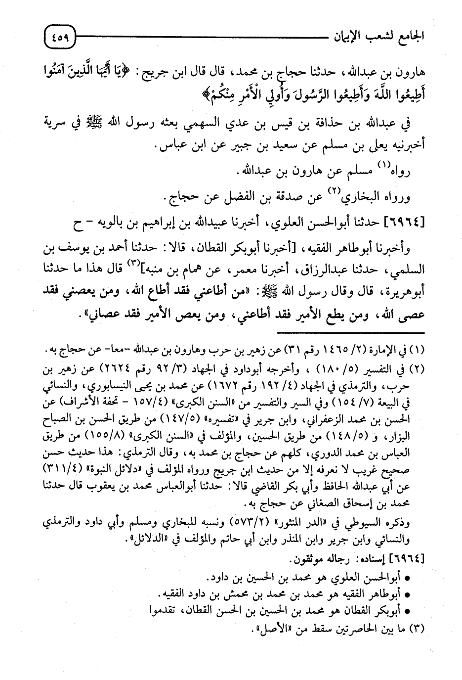 6964 - حَدَّثَنَا أَبُو الْحَسَنِ الْعَلَوِيُّ، أنا عُبَيْدُ اللهِ بْنُ إِبْرَاهِيمَ بْنِ بَالَوَيْهِ، وَأَنَا أَبُو طَاهِرٍ الْفَقِيهُ، قَالَ: نا أَبُو بَكْرٍ الْقَطَّانُ قَالَا: نا أَحْمَدُ بْنُ يُوسُفَ السُّلَمِيُّ، نا عَبْدُ الرَّزَّاقِ، نا مَعْمَرٌ، عَنْ هَمَّامِ بْنِ مُنَبِّهٍ، هَذَا مَا حَدَّثَنَا أَبُو هُرَيْرَةَ قَالَ: وَقَالَ رَسُولُ اللهِ صَلَّى اللَّهُ عَلَيْهِ وَسَلَّمَ: " §مَنْ أَطَاعَنِي فَقَدْ أَطَاعَ اللهَ، وَمَنْ يَعْصِنِي فَقَدْ عَصَى اللهَ، وَمَنْ يُطِعِ الْأَمِيرَ فَقَدْ أَطَاعَنِي، وَمَنْ يَعْصِ الْأَمِيرَ فَقَدْ عَصَانِي " -[460]- رَوَاهُ مُسْلِمٌ، عَنْ مُحَمَّدِ بْنِ رَافِعٍ، عَنْ عَبْدِ الرَّزَّاقِ