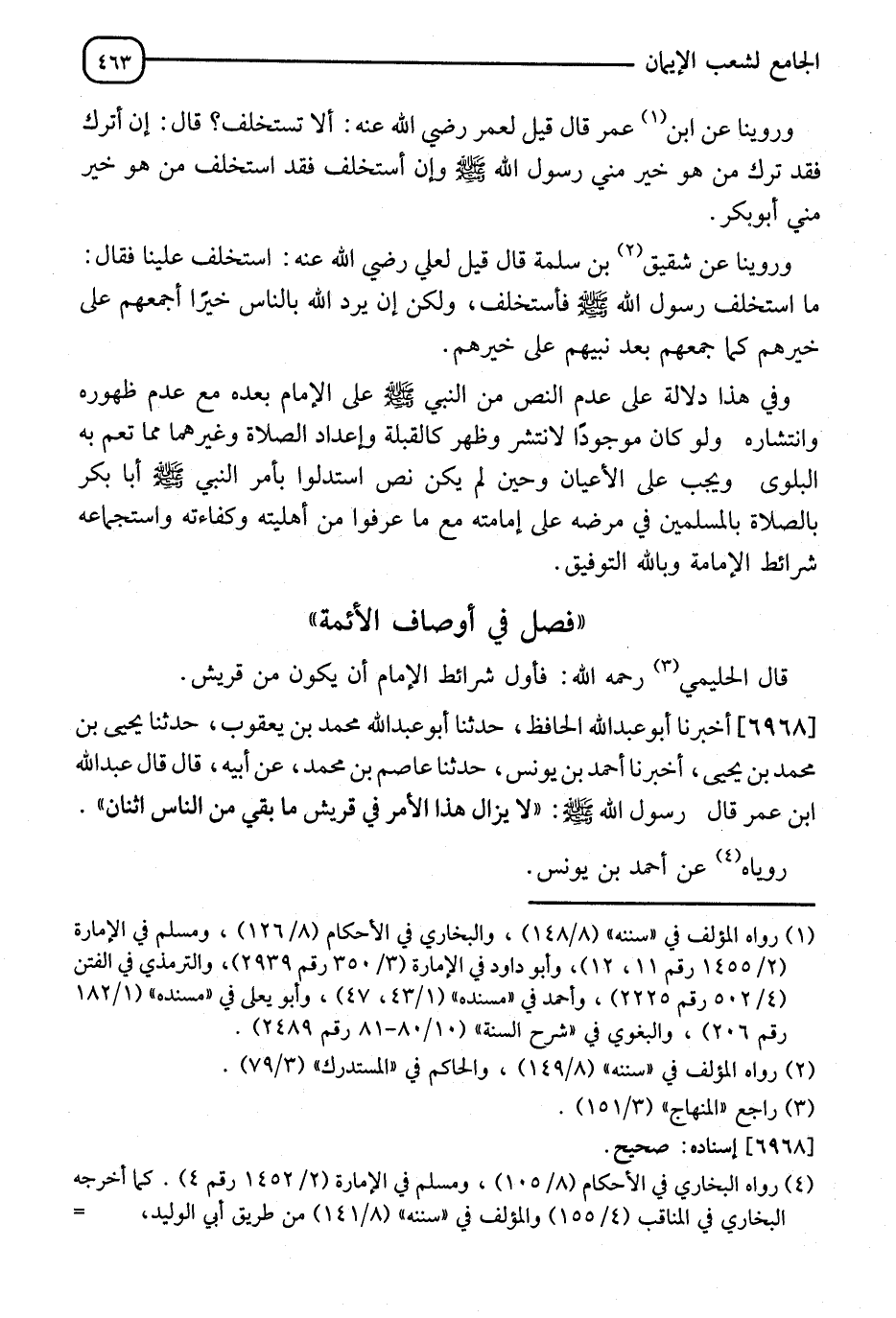 §فَصْلٌ فِي أَوْصَافِ الْأَئِمَّةِ قَالَ الْحَلِيمِيُّ رَحِمَهُ اللهُ: " فَأَوَّلُ شَرَائِطِهَا أَنْ يَكُونَ الْإِمَامُ مِنْ قُرَيْشٍ "