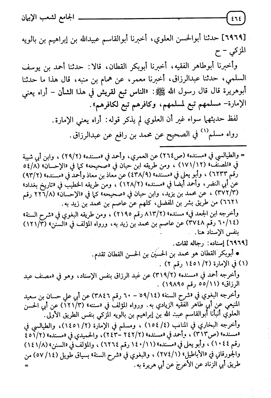 6969 - حَدَّثَنَا أَبُو الْحَسَنِ الْعَلَوِيُّ، أنا أَبُو الْقَاسِمِ بْنُ بَالَوَيْهِ الْمُزَكِّي، ح وَأَخْبَرَنَا أَبُو طَاهِرٍ الْفَقِيهُ، أنا أَبُو بَكْرٍ الْقَطَّانُ، قَالَا: نا أَحْمَدُ بْنُ يُوسُفَ السُّلَمِيُّ، نا عَبْدُ الرَّزَّاقِ، أنا مَعْمَرٌ، عَنْ هَمَّامِ بْنِ مُنَبِّهٍ، قَالَ: هَذَا مَا حَدَّثَنَا أَبُو هُرَيْرَةَ قَالَ: قَالَ رَسُولُ اللهِ صَلَّى اللَّهُ عَلَيْهِ وَسَلَّمَ: §" النَّاسُ تَبَعٌ لِقُرَيْشٍ فِي هَذَا الشَّأْنِ - أُرَاهُ يَعْنِي الْإِمَارَةَ - مُسْلِمُهُمْ تَبَعٌ لِمُسْلِمِهِمْ، وَكَافِرُهُمْ تَبَعٌ لِكَافِرِهِمْ " لَفْظُ حَدِيثِهِمَا سَوَاءٌ غَيْرَ أَنَّ الْعَلَوِيَّ لَمْ يُذْكَرْ قَوْلَهُ: أُرَاهُ - يَعْنِي الْإِمَارَةَ -، رَوَاهُ مُسْلِمٌ فِي الصَّحِيحِ، عَنْ مُحَمَّدِ بْنِ رَافِعٍ، عَنْ عَبْدِ الرَّزَّاقِ، -[465]- وَقَالَ الْحَلِيمِيُّ: " وَالثَّانِيَةُ أَنْ يَكُونَ عَالِمًا بِأَحْكَامِ الدِّينِ يُصَلِّي بِالنَّاسِ، فَلَا يُؤْتَى مِنْ عَوَارِضِ صَلَاتِهِ مِنْ جَهْلٍ بِمَا يُحْتَاجُ إِلَيْهِ فِي إِتْمَامِ صَلَاتِهِ، وَيَأْخُذُ الصَّدَقَاتِ، فَلَا يُوَلِّي لَهَا مَنْ جَهِلَ بِأَوْقَاتِهَا، وَأَقْدَارِهَا، وَمَصَارِفِهَا، وَالْأَمْوَالِ الَّتِي تَجِبُ فِيهَا أَوْ لَا يَجِبُ، وَيَقْضِي بَيْنَهُمْ، فَلَا يُوَلِّي فِيمَا يُنْظَرُ فِيهِ بَيْنَ الْخَصْمَيْنِ، وَيُفْصَلُ بِهِ بَيْنَهُمَا مَنْ جَهِلَ بِمَا يَحْتَاجُ إِلَيْهِ، وَيُجَاهِدُ بِالْمُسْلِمِينَ فِي سَبِيلِ اللهِ، فَلَا يُوَلِّي فِي اسْتِعْدَادِهِ وَخُرُوجِهِ، وَمُلَاقَاتِهِ وَمَا يُغْنِمُهُ اللهُ تَعَالَى وَأَتَاهُ مِنْ أَمْوَالِ الْمُشْرِكِينَ، أَوْ يُفِيئُهُ عَلَيْهِمْ، أَوْ يُعَلِّقُهُ بِخَيْلِهِ مِنْ رِقَابِهِمْ، مَنْ فُتُورٍ، وَلَا جُبْنٍ، وَلَا خَوَرٍ، وَلَا جَهْلٍ بِمَا يَلْزَمُهُ أَنْ يَعْمَلَ فِيهِ وَيَسِيَرُ بِهِ فِيهِمْ، وَيَنْظُرَ فِي حُدُودِ اللهِ إِذَا رُفِعَتْ إِلَيْهِ، فَلَا يُوَلِّي فِيهَا مَنْ جَهِلَ بِمَا بَدَرَ مِنْهُ، أَوْ يُقِيمُ وَيُوَلِّي الصِّغَارَ، والْمَجَانِينَ، وَالْغَائِبِينَ، وَحُقُوقِهِمْ فَلَا يُوَلِّي فِيهَا مَنْ جَهِلَ بِمَا فِيهِ النَّظَرُ والْغِبْطَةُ لَهُمْ، وَالثَّالِثَةُ: أَنْ يَكُونَ عَدْلًا قَيِّمًا فِي دِينِهِ وَتَعَاطِيهِ، وَمُعَامَلَاتِهِ، وَبَسَطَ الْكَلَامَ فِي الْحُجَّةِ فِيهِ قَالَ: وَإِنْ لَمْ يَكُنْ لِمَنْ جَمَعَ شَرَائِطَ الْإِمَامَةِ عَهْدٌ مِنْ إِمَامٍ قَبْلَهُ وَاحْتِيجَ إِلَى نَصْبِ الْمُسْلِمِينَ لَهُ فَأَشْبَهُ مَا يُقَالُ فِي هَذَا الْبَابِ عِنْدِي وَأَوْلَاهُ بِالْحَقِّ أَنَّهُ إِذَا اجْتَمَعَ أَرْبَعُونَ عَدْلًا مِنَ الْمُسْلِمِينَ أَحَدُهُمْ عَالِمٌ يَصْلُحُ لِلْقَضَاءِ بَيْنَ النَّاسِ فَعَقَدُوا لَهُ الْإِمَامَةَ بَعْدَ إِمْعَانِ النَّظَرِ، وَالْمُبَالَغَةِ فِي الِاجْتِهَادِ، تَثْبُتُ لَهُ الْإِمَامَةُ، وَوَجَبَتْ لَهُ عَلَيْهِمُ الطَّاعَةَ، وَجَعَلَ أَصْلَ ذَلِكَ اجْتِمَاعَ الصَّحَابَةِ بَعْدَ الرَّسُولِ صَلَّى اللَّهُ عَلَيْهِ وَسَلَّمَ عَلَى أَبِي بَكْرٍ، وَاشْتِقَاقَهُمْ لَهُ الْإِمَامَةَ الْمُطْلَقَةَ الْعَامَّةَ، مِنْ إِمَامَةِ الصَّلَاةِ، وَالصَّلَاةُ الَّتِي لَا تَجُوزُ إِلَّا بِالِاجْتِمَاعِ عَلَيْهَا هِيَ صَلَاةُ الْجَمَاعَةِ، وَقَدْ قَامَ الدَّلِيلُ عَلَى أَنَّ صَلَاةَ الْجُمُعَةِ لَا تَنْعَقِدُ إِلَّا بِأَرْبَعِينَ رَجُلًا، أَحَدُهُمْ إِمَامٌ -[466]- يَتَوَلَّى بِهِمُ الصَّلَاةَ، وَالْآخَرُونَ يَتَّبِعُونَهُ، كَذَلِكَ أَوْجَبْنَا أَنْ يَكُونَ مَنْ يَنْعَقِدُ بِهِمُ الْإِمَامَةُ أَرْبَعُونَ رَجُلًا، أَحَدُهُمْ عَالِمٌ يَصْلُحُ مِثْلُهُ لِلْقَضَاءِ فَيَكُونُ هُوَ الَّذِي يَتَوَلَّى الِاجْتِه