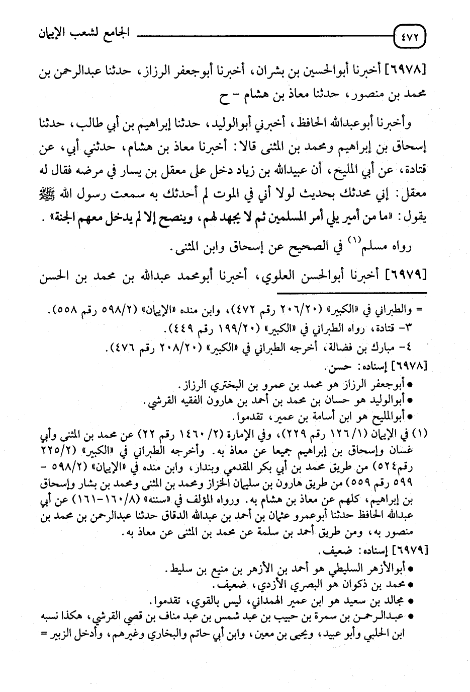 6978 - أَخْبَرَنَا أَبُو الْحُسَيْنِ بْنُ بِشْرَانَ، أنا أَبُو جَعْفَرٍ الرَّزَّازُ، نا عَبْدُ الرَّحْمَنِ بْنُ مُحَمَّدِ بْنِ مَنْصُورٍ، نا مُعَاذُ بْنُ هِشَامٍ، ح وَأَخْبَرَنَا أَبُو عَبْدِ اللهِ الْحَافِظُ، أَخْبَرَنِي أَبُو الْوَلِيدِ، نا إِبْرَاهِيمُ بْنُ أَبِي طَالِبٍ، نا إِسْحَاقُ بْنُ إِسْحَاقَ، وَمُحَمَّدُ بْنُ الْمُثَنَّى، قَالَا: أنا مُعَاذُ بْنُ هِشَامٍ، حَدَّثَنِي أَبِي، عَنْ قَتَادَةَ، عَنْ أَبِي الْمَلِيحِ، أَنَّ عُبَيْدَ اللهِ بْنَ زِيَادٍ، دَخَلَ عَلَى مَعْقِلِ بْنِ يَسَارٍ فِي مَرَضِهِ فَقَالَ لَهُ مَعْقِلٌ: إِنِّي مُحَدِّثُكَ بِحَدِيثٍ لَوْلَا أَنِّي فِي الْمَوْتِ لَمْ أُحَدِّثْكَ بِهِ، سَمِعْتُ رَسُولَ اللهِ صَلَّى اللَّهُ عَلَيْهِ وَسَلَّمَ يَقُولُ: §" مَا مِنْ أَمِيرٍ يَلِي أَمْرَ الْمُسْلِمِينَ ثُمَّ لَا يَجْهَدُ لَهُمْ وَيَنْصَحُ إِلَّا لَمْ يَدْخُلْ مَعَهُمُ الْجَنَّةَ " رَوَاهُ مُسْلِمٌ فِي الصَّحِيحِ، عَنْ إِسْحَاقَ، وَابْنِ الْمُثَنَّى