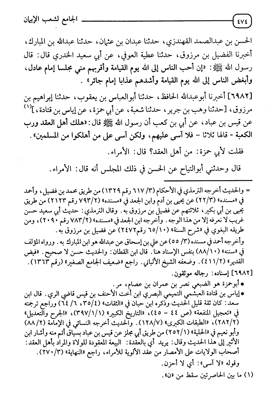 6982 - أَخْبَرَنَا أَبُو عَبْدِ اللهِ الْحَافِظُ، نا أَبُو الْعَبَّاسِ بْنُ يَعْقُوبَ، نا إِبْرَاهِيمُ بْنُ مَرْزُوقٍ، نا وَهْبُ بْنُ جَرِيرٍ، نا شُعْبَةُ، عَنْ أَبِي حَمْزَةَ، عَنْ إِيَاسِ بْنِ قَتَادَةَ، عَنْ قَيْسِ بْنِ عَبَّادٍ، عَنْ أُبَيِّ بْنِ كَعْبٍ، أَنَّ رَسُولَ اللهِ صَلَّى اللَّهُ عَلَيْهِ وَسَلَّمَ قَالَ: §" هَلَكَ أَهْلُ الْعَقْدِ وَرَبِّ الْكَعْبَةِ - قَالَهَا ثَلَاثًا - فَلَا آسَى عَلَيْهِمْ، وَلَكِنِّي آسَى عَلَى مَنْ أُهْلِكُوا مِنَ الْمُسْلِمِينَ " فَقُلْتُ لِأَبِي حَمْزَةَ: مَنْ أَهْلُ الْعَقْدِ؟ قَالَ: " الْأُمَرَاءُ "، قَالَ: وَحَدَّثَنِي أَبُو التَّيَّاحِ، عَنِ الْحَسَنِ فِي ذَلِكَ الْمَجْلِسِ أَنَّهُ قَالَ: " الْأُمَرَاءُ "
