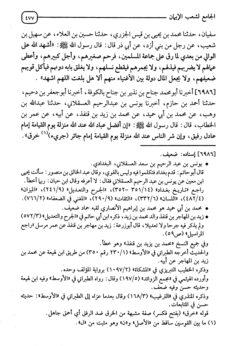 6986 - أَخْبَرَنَا أَبُو مُحَمَّدٍ جَنَاحُ بْنُ نَذِيرِ بْنِ جَنَاحٍ بِالْكُوفَةِ، أنا أَبُو جَعْفَرِ بْنُ دُحَيْمٍ، نا أَحْمَدُ بْنُ حَازِمٍ، أنا يُونُسُ بْنُ عَبْدِ الرَّحِيمِ الْعَسْقَلَانِيُّ، نا عَبْدُ اللهِ بْنُ وَهْبٍ، عَنْ مُحَمَّدِ بْنِ أَبِي حُمَيْدٍ، عَنْ مُحَمَّدِ بْنِ زَيْدِ بْنِ الْمُهَاجِرِ، عَنْ أَبِيهِ، عَنْ عُمَرَ بْنِ الْخَطَّابِ، قَالَ: قَالَ رَسُولُ اللهِ صَلَّى اللَّهُ عَلَيْهِ وَسَلَّمَ: " إِنَّ §أَفْضَلَ عِبَادِ اللهِ عِنْدَ اللهِ مَنْزِلَةً يَوْمَ الْقِيَامَةِ إِمَامٌ عَادِلٌ رَفِيقٌ، وَإِنَّ شَرَّ النَّاسِ مَنْزِلَةً يَوْمَ الْقِيَامَةِ إِمَامٌ جَائِرٌ خَرِقٌ "