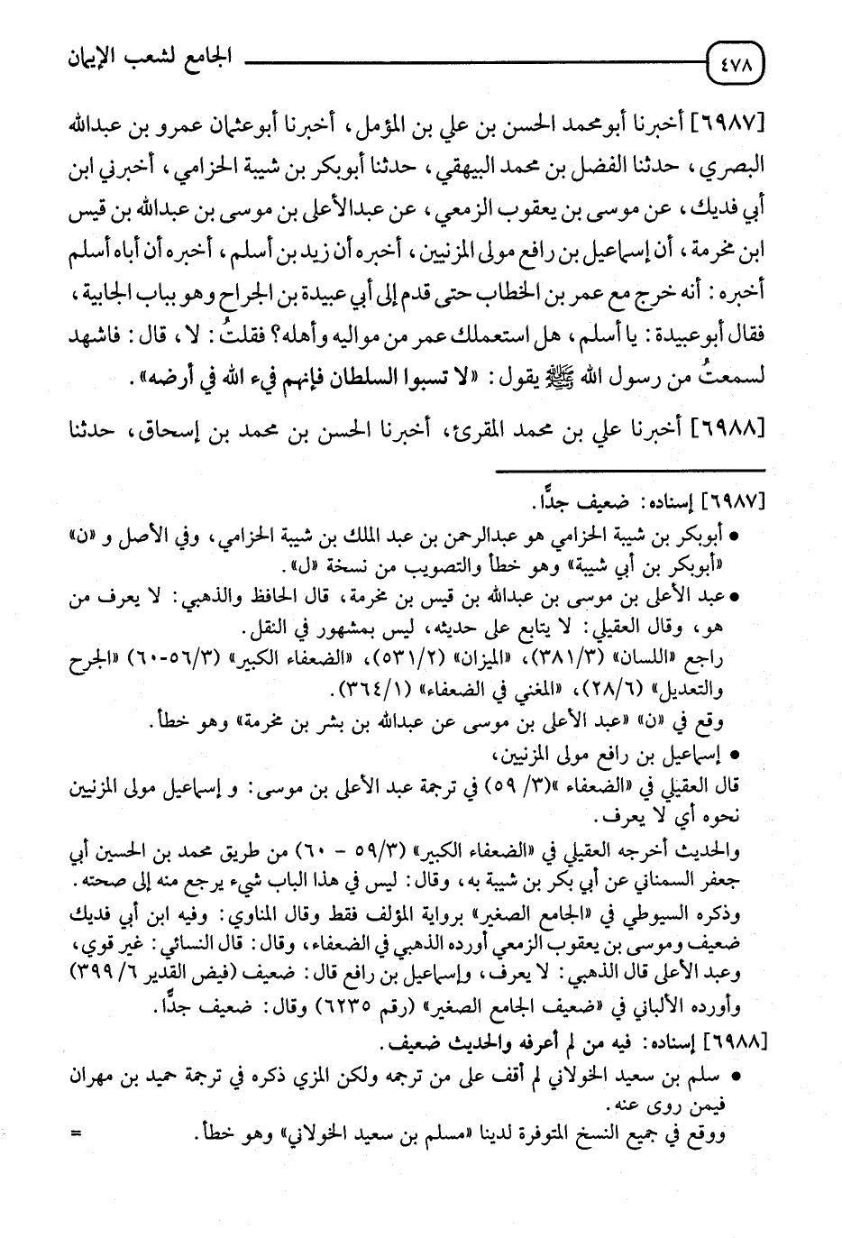 6987 - أَخْبَرَنَا أَبُو مُحَمَّدٍ الْحُسَيْنُ بْنُ عَلِيِّ بْنِ الْمُؤَمَّلِ، أنا أَبُو عُثْمَانَ عَمْرُو بْنُ عَبْدِ اللهِ الْبَصْرِيُّ، نا الْفَضْلُ بْنُ مُحَمَّدٍ الْبَيْهَقِيُّ، نا أَبُو بَكْرِ بْنُ أَبِي شَيْبَةَ، أَخْبَرَنِي ابْنُ أَبِي فُدَيْكٍ، عَنْ مُوسَى بْنِ يَعْقُوبَ الرَّبَعِيِّ، عَنْ عَبْدِ الْأَعْلَى بْنِ مُوسَى بْنِ عَبْدِ اللهِ بْنِ قَيْسِ بْنِ مَخْرَمَةَ، أَنَّ إِسْمَاعِيلَ بْنَ رَافِعٍ، مَوْلَى الْمُزَنِيِّينَ، أَخْبَرَهُ أَنَّ زَيْدَ بْنَ أَسْلَمَ، أَخْبَرَهُ أَنَّ أَبَاهُ أَسْلَمَ أَخْبَرَهُ أَنَّهُ، خَرَجَ مَعَ عُمَرَ بْنِ الْخَطَّابِ حَتَّى قَدِمَ عَلَى أَبِي عُبَيْدَةَ بْنِ الْجَرَّاحِ وَهُوَ بِبَابِ الْجَابِيَةِ، فَقَالَ أَبُو عُبَيْدَةَ: يَا أَسْلَمُ هَلِ اسْتَعْمَلَكَ عُمَرُ مِنْ مَوَالِيهِ وَأَهْلِهِ؟ فَقُلْتُ: لَا، قَالَ: فَأَشْهَدُ لَسَمِعْتُ رَسُولَ اللهِ صَلَّى اللَّهُ عَلَيْهِ وَسَلَّمَ وَهُوَ يَقُولُ: " §لَا تَسُبُّوا السُّلْطَانَ، فَإِنَّهُمْ ظِلُّ اللهِ فِي أَرْضِهِ "