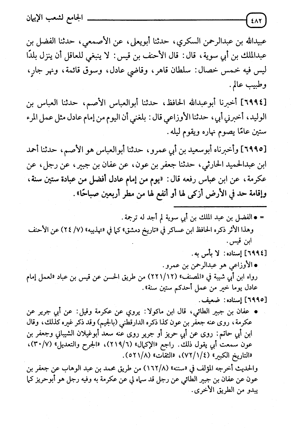 6995 - وَأَخْبَرَنَاهُ أَبُو سَعِيدِ بْنُ أَبِي عَمْرٍو، نا أَبُو الْعَبَّاسِ هُوَ الْأَصَمُّ، نا أَحْمَدُ بْنُ عَبْدِ الْحَمِيدِ الْحَارِثِيُّ، نا جَعْفَرُ بْنُ عَوْنٍ، عَنْ عَفَّانَ بْنِ جُبَيْرٍ، عَنْ رَجُلٍ، عَنْ عِكْرِمَةَ، عَنِ ابْنِ عَبَّاسٍ، رَفَعَهُ قَالَ: " §يَوْمٌ مِنْ إِمَامٍ عَادِلٍ أَفْضَلُ مِنْ عِبَادَةِ سِتِّينَ سَنَةً، وَإِقَامَةُ حَدٍّ فِي أَرْضٍ أَزْكَى لَهَا أَوْ أَنْفَعُ لَهَا مِنْ مَطَرٍ أَرْبَعِينَ صَبَاحًا " -[483]- وَرُوِّينَاهُ فِي كِتَابِ السُّنَنِ مِنْ حَدِيثِ أَحْمَدَ بْنِ يُونُسَ، عَنْ سَعْدِ بْنِ غَيْلَانَ، عَنْ عَفَّانَ بْنِ جُبَيْرٍ، عَنْ أَبِي جَرِيرٍ، أَوْ جَرِيرٍ الْأَزْدِيِّ، عَنْ عِكْرِمَةَ، عَنِ ابْنِ عَبَّاسٍ، عَنِ النَّبِيِّ صَلَّى اللَّهُ عَلَيْهِ وَسَلَّمَ