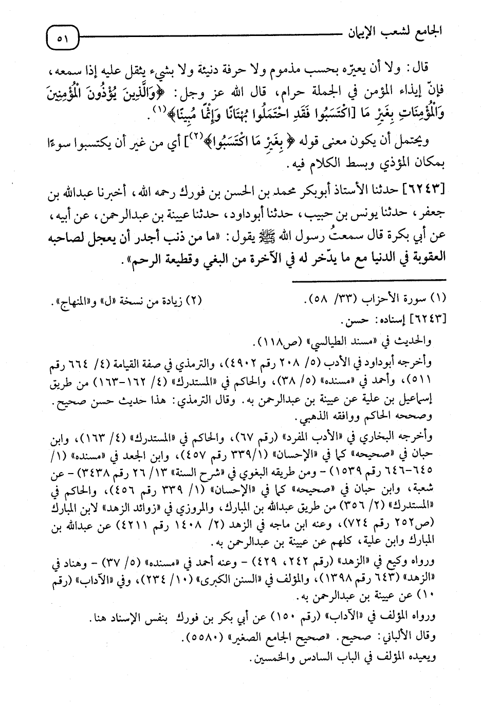 6243 - حَدَّثَنَا الْأُسْتَاذُ أَبُو بَكْرٍ مُحَمَّدُ بْنُ الْحَسَنِ بْنُ فُورَكٍ رَحِمَهُ اللهُ، أَنَا عَبْدُ اللهِ بْنُ جَعْفَرٍ، نا يُونُسُ بْنُ حَبِيبٍ، نا أَبُو دَاوُدَ، نا عُيَيْنَةُ بْنُ عَبْدِ الرَّحْمَنِ، عَنْ أَبِيهِ، عَنْ أَبِي بَكْرَةَ، قَالَ: سَمِعْتُ رَسُولَ اللهِ صَلَّى اللَّهُ عَلَيْهِ وَسَلَّمَ يَقُولُ: §" مَا مِنْ ذَنْبٍ أَجْدَرُ أَنْ يُعَجَّلَ لِصَاحِبِهِ الْعُقُوبَةُ فِي الدُّنْيَا، مَعَ مَا يُدَّخَرُ لَهُ فِي الْآخِرَةِ مِنَ الْبَغْيِ وَقَطِيعَةِ الرَّحِمِ "