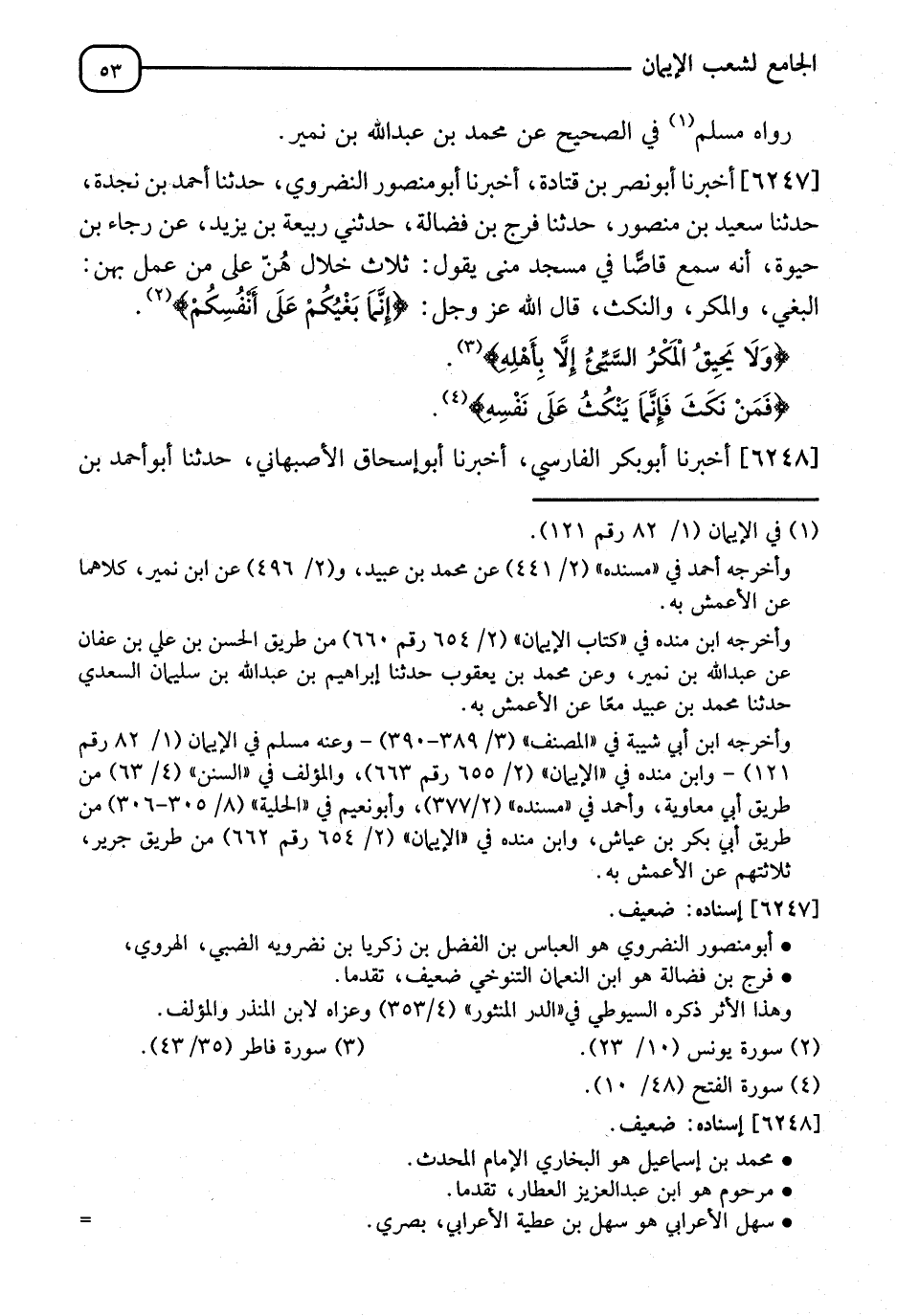 6247 - أَخْبَرَنَا أَبُو نَصْرِ بْنُ قَتَادَةَ، أَنَا أَبُو مَنْصُورٍ النَّضْرَوِيُّ، نا أَحْمَدُ بْنُ نَجْدَةَ، نا سَعِيدُ بْنُ مَنْصُورٍ، نا فَرَجُ بْنُ فَضَالَةُ، حَدَّثَنِي رَبِيعَةُ بْنُ يَزِيدَ، عَنْ رَجَاءَ بْنِ حَيْوَةَ، أَنَّهُ سَمِعَ قَاصًّا فِي مَسْجِدِ مِنًى، يَقُولُ:" §ثَلَاثُ خِلَالٍ هُنَّ عَلَى مَنْ عُمِلَ بِهِنَّ: الْبَغْيُ، وَالْمَكْرُ، وَالنَّكْثُ، قَالَ اللهُ عَزَّ وَجَلَّ: {إِنَّمَا بَغْيُكُمْ عَلَى أَنْفُسَكُمْ} [يونس: 23]، {وَلَا يَحِيقُ الْمَكْرُ السَّيِّئُ إِلَّا بِأَهْلِهِ} [فاطر: 43]، {وَمَنْ نَكَثَ فَإِنَّمَا يَنْكُثُ عَلَى نَفْسِهِ} "