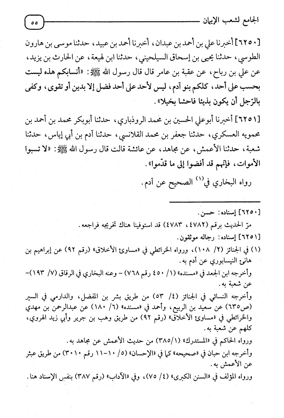 6251 - أَخْبَرَنَا أَبُو عَلِيٍّ الْحُسَيْنُ بْنُ مُحَمَّدٍ الرُّوذْبَارِيُّ، نا أَبُو بَكْرٍ مُحَمَّدُ بْنُ أَحْمَدَ بْنِ مَحْمَوَيْهِ الْعَسْكَرِيُّ، نا جَعْفَرُ بْنُ مُحَمَّدٍ الْقَلَانِسِيُّ، نا آدَمُ بْنُ أَبِي إِيَاسَ، نا شُعْبَةُ، نا الْأَعْمَشُ، عَنْ مُجَاهِدٍ، عَنْ عَائِشَةَ، قَالَتْ: قَالَ رَسُولُ اللهِ صَلَّى اللَّهُ عَلَيْهِ وَسَلَّمَ: §" لَا تَسُبُّوا الْأَمْوَاتَ فَإِنَّهُمْ قَدْ أَفْضَوْا إِلَى مَا قَدِمُوا " رَوَاهُ الْبُخَارِيُّ فِي الصَّحِيحِ