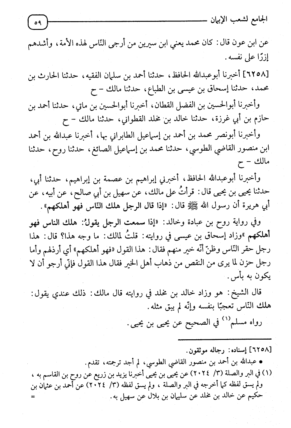 6258 - أَخْبَرَنَا أَبُو عَبْدِ اللهِ الْحَافِظُ، نا أَحْمَدُ بْنُ سَلْمَانَ الْفَقِيهُ، نا الْحَارِثُ بْنُ مُحَمَّدٍ، نا إِسْحَاقُ بْنُ عِيسَى بْنِ الطَّبَّاعِ، نا مَالِكٌ، ح، وَأَخْبَرَنَا أَبُو الْحُسَيْنِ بْنُ الْفَضْلِ الْقَطَّانُ، أَنَا أَبُو الْحُسَيْنِ بْنُ مَاتِي، نا أَحْمَدُ بْنُ حَازِمِ بْنِ أَبِي غَرَزَةَ، نا خَالِدُ بْنُ مَخْلَدٍ الْقَطَوَانِيُّ، نا مَالِكٌ، ح، وَأَخْبَرَنَا أَبُو نَصْرٍ مُحَمَّدُ بْنُ أَحْمَدَ بْنِ إِسْمَاعِيلَ الطَّبَرَانِيُّ بِهَا، نا عَبْدُ اللهِ بْنُ أَحْمَدَ بْنِ مَنْصُورٍ الْقَاضِي الطُّوسِيُّ، نا مُحَمَّدُ بْنُ إِسْمَاعِيلَ الصَّائِغُ، نا رَوْحٌ، نا مَالِكٌ، ح، وَأَخْبَرَنَا أَبُو عَبْدِ اللهِ الْحَافِظُ، أَخْبَرَنِي إِبْرَاهِيمُ بْنُ عِصْمَةَ بْنِ إِبْرَاهِيمَ، نا أَبِي، نا يَحْيَى بْنُ يَحْيَى، قَالَ: قَرَأْتُ عَلَى مَالِكٍ، عَنْ سُهَيْلِ بْنِ أَبِي صَالِحٍ، عَنْ أَبِيهِ، عَنْ أَبِي هُرَيْرَةَ، أَنَّ رَسُولَ اللهِ صَلَّى اللَّهُ عَلَيْهِ وَسَلَّمَ قَالَ: " §إِذَا قَالَ الرَّجُلُ: هَلَكَ النَّاسُ فَهُوَ أَهْلَكُهُمْ " وَفِي رِوَايَةِ رَوْحِ بْنِ عُبَادَةَ، وَخَالِدٍ " إِذَا سَمِعْتَ الرَّجُلَ يَقُولُ: هَلَكَ النَّاسُ فَهُوَ أَهْلَكُهُمْ "، وَزَادَ إِسْحَاقُ بْنُ عِيسَى فِي رِوَايَتِهِ، قُلْتُ لِمَالِكٍ مِمَّا وَجْهُ هَذَا؟ قَالَ: هَذَا رَجُلٌ حَقَّرَ النَّاسَ وَظَنَّ أَنَّهُ خَيْرٌ مِنْهُمْ، فَقَالَ هَذَا الْقَوْلَ، فَهُوَ أَهْلَكُهُمْ: أَيْ أَرْذَلُهُمْ. وَأَمَّا رَجُلٌ حَزِنَ لِمَا يَرَى مِنَ النَّقْصِ فِي ذَهَابِ أَهْلِ الْخَيْرِ، فَقَالَ هَذَا الْقَوْلَ فَإِنِّي لَأَرْجُو أَنْ لَا يَكُونَ بَأْسٌ. قَالَ الشَّيْخُ: " وَزَادَ خَالِدُ بْنُ مَخْلَدٍ فِي رِوَايَتِهِ، قَالَ مَالِكٌ: وَذَلِكَ عِنْدِي يَقُولُ: هَلَكَ النَّاسُ مُعْجَبًا بِنَفْسِهِ وَأَنَّهُ لَمْ يَبْقَ مِثْلُهُ ". وَرَوَاهُ مُسْلِمٌ فِي الصَّحِيحِ، عَنْ يَحْيَى بْنِ يَحْيَى
