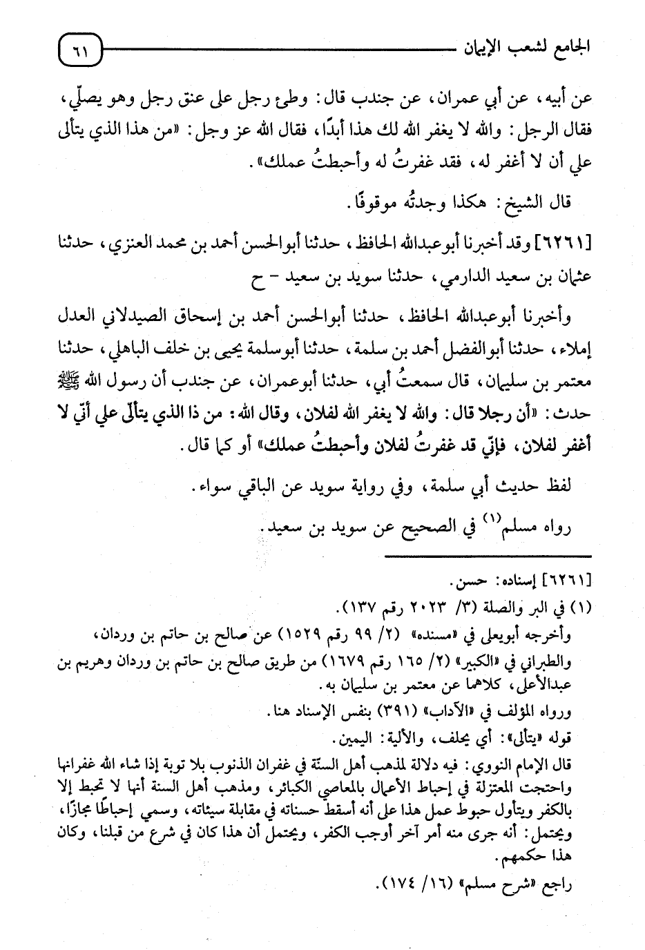 6261 - أَخْبَرَنَا أَبُو عَبْدِ اللهِ الْحَافِظُ، أَنَا أَبُو الْحَسَنُ أَحْمَدُ بْنُ مُحَمَّدٍ الْعَنَزِيُّ، نا عُثْمَانُ بْنُ سَعِيدٍ الدَّارِمِيُّ، نا سُوَيْدُ بْنُ سَعِيدٍ، ح، وَأَخْبَرَنَا أَبُو عَبْدِ اللهِ، نا أَبُو الْحَسَنِ أَحْمَدُ بْنُ إِسْحَاقَ الصَّيْدَلَانِيُّ الْعَدْلُ، إِمْلَاءً، نا أَبُو الْفَضْلِ أَحْمَدُ بْنُ سَلَمَةَ، نا أَبُو سَلَمَةَ يَحْيَى بْنُ خَلَفٍ الْبَاهِلِيُّ، نا مُعْتَمِرُ بْنُ سُلَيْمَانَ، قَالَ: سَمِعْتُ أَبِي، نا أَبُو عِمْرَانَ، عَنْ جُنْدُبٍ، أَنَّ رَسُولَ اللهِ صَلَّى اللَّهُ عَلَيْهِ وَسَلَّمَ حَدَّثَ، " أَنَّ رَجُلًا قَالَ: وَاللهِ لَا يَغْفِرُ اللهُ لِفُلَانٍ، وَقَالَ اللهُ: §" مَنْ ذَا الَّذِي يَتَأَلَّى عَلَيَّ أَنِّي لَا أَغْفِرُ لِفُلَانٍ فَإِنِّي غَفَرْتُ لِفُلَانٍ وَأَحْبَطْتُ عَمَلَكَ أَوْ كَمَا قَالَ " " لَفْظُ حَدِيثِ أَبِي سَلَمَةَ، وَفِي رِوَايَةِ سُوَيْدٍ، عَنْ عُرْوَةَ وَالْبَاقِي سَوَاءٌ " رَوَاهُ مُسْلِمٌ فِي الصَّحِيحِ، عَنْ سُوَيْدِ بْنِ سَعِيدٍ