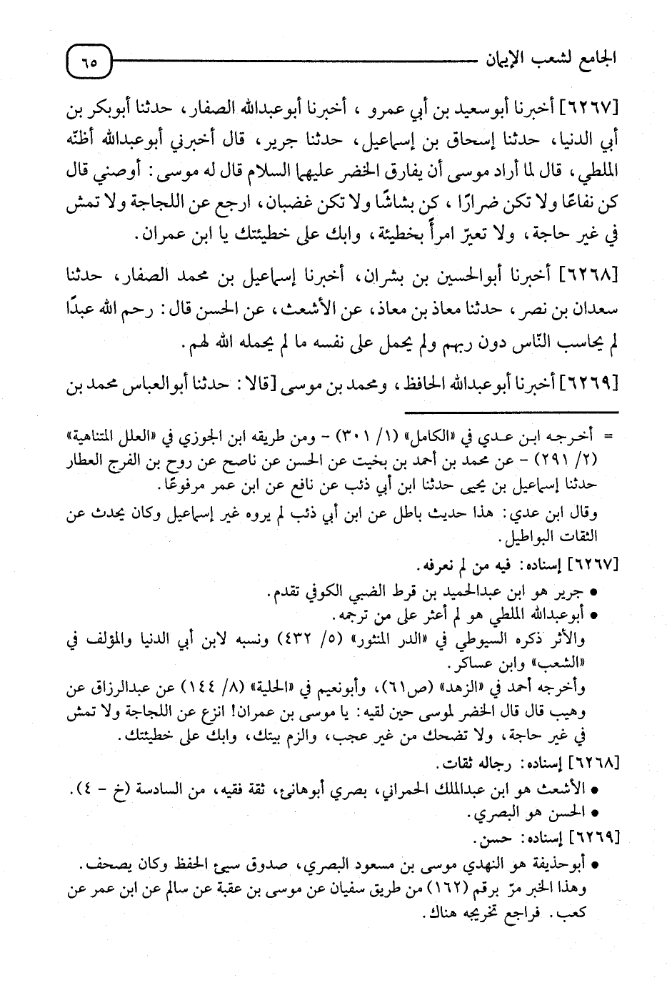 6267 - أَخْبَرَنَا أَبُو سَعِيدِ بْنُ أَبِي عَمْرٍو، أَنَا عَبْدُ اللهِ الصَّفَارُ، نا أَبُو بَكْرِ بْنُ أَبِي الدُّنْيَا، نا إِسْحَاقُ بْنُ إِسْمَاعِيلَ، نا جَرِيرٌ، قَالَ: أَخْبَرَنِي أَبُو عَبْدِ اللهِ أَظُنُّهُ الْمَلْطِيَّ، قَالَ: " أَرَادَ مُوسَى أَنْ يُفَارِقَ الْخَضِرَ عَلَيْهِمَا السَّلَامُ، قَالَ لَهُ مُوسَى: §أَوْصِنِي. قَالَ: كُنْ نَفَّاعًا، وَلَا تَكُنْ ضَرَّارًا، كُنْ بَشَّاشًا، وَلَا تَكُنْ غَضْبَانَ، ارْجِعْ عَنِ اللَّجَاجَةِ، وَلَا تَمْشِ فِي غَيْرِ حَاجَةٍ، وَلَا تَعَيِّرِ امْرَأً بِخَطِيئَتِهِ، وَابْكِ عَلَى خَطِيئَتِكَ يَا ابْنَ عِمْرَانَ "