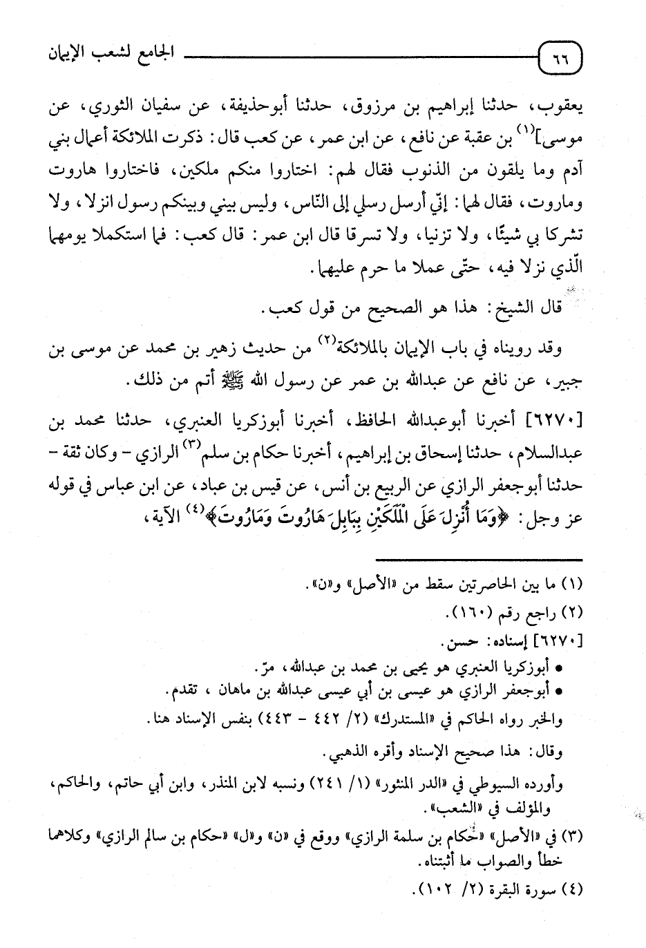6270 - أَخْبَرَنَا أَبُو عَبْدِ اللهِ الْحَافِظُ، أَنَا أَبُو زَكَرِيَّا الْعَنْبَرِيُّ، نا مُحَمَّدُ بْنُ عَبْدِ السَّلَامِ، نا إِسْحَاقُ بْنُ إِبْرَاهِيمَ، أَنَا حَكَّامُ بْنُ سَلْمٍ الرَّازِيُّ وَكَانَ ثِقَةً، نا أَبُو جَعْفَرٍ الرَّازِيُّ، عَنِ الرَّبِيعِ بْنِ أَنَسٍ، عَنْ قَيْسِ بْنِ عَبَّادٍ، عَنِ ابْنِ عَبَّاسٍ، فِي قَوْلِهِ عَزَّ وَجَلَّ: {وَمَا أُنْزِلَ عَلَى الْمَلَكَيْنِ بِبَابِلَ هَارُوتَ وَمَارُوتَ} [البقرة: 102]، الْآيَةَ، -[67]- قَالَ: إِنَّ النَّاسَ بَعْدَ آدَمَ وَقَعُوا فِي الشِّرْكِ اتَّخَذُوا هَذِهِ الْأَصْنَامَ، وَعَبَدُوا غَيْرَ اللهِ عَزَّ وَجَلَّ، قَالَ: فَجَعَلَتِ الْمَلَائِكَةُ يَدْعُونَ عَلَيْهِمْ، وَيَقُولُونَ: رَبَّنَا خَلَقْتَ عِبَادَكَ وَأَحْسَنْتَ خَلْقَهُمْ، وَرَزَقْتَهُمْ فَأَحْسَنْتَ رِزْقَهُمْ فَعَصَوْكَ وَعَبَدُوا غَيْرَكَ، اللهُمَّ اللهُمَّ يَدْعُونَ عَلَيْهِمْ، فَقَالَ لَهُمُ اللهُ تَبَارَكَ وَتَعَالَى: إِنَّهُمْ فِي. . . فَجَعَلُوا لَا يَعْذُرُونَهُمْ. قَالَ: " §اخْتَارُوا مِنْكُمُ اثْنَيْنِ أُهْبِطْهُمَا إِلَى الْأَرْضِ، فَآمُرُهُمَا وَأَنْهَاهُمَا "، فَاخْتَارُوا هَارُوتَ وَمَارُوتَ. . قَالَ: وَذَكَرَ الْحَدِيثَ بِطُولِهِ فِيهِمَا، وَقَالَ فِيهِ شَرِبَا الْخَمْرَ، وَانْتَشَيَا، وَوَقَعَا بِالْمَرْأَةِ، وَقَتَلَا النَّفْسَ، وَكَثُرَ اللَّغَطُ فِيمَا بَيْنَهُمَا وَبَيْنَ الْمَلَائِكَةِ، فَنَظَرُوا إِلَيْهِمَا وَمَا يَعْمَلَانِ فَفِي ذَلِكَ أَنْزَلَ اللهُ عَزَّ وَجَلَّ: {وَالْمَلَائِكَةُ يُسَبِّحُونَ بِحَمْدِ رَبِّهِمْ وَيَسْتَغْفِرُونَ لِمَنْ فِي الْأَرْضِ} [الشورى: 5]، الْآيَةَ، قَالَ: فَجَعَلَ بَعْدَ ذَلِكَ الْمَلَائِكَةُ يَعْذَرُونَ أَهْلَ الْأَرْضِ وَيَدْعُونَ لَهُمْ