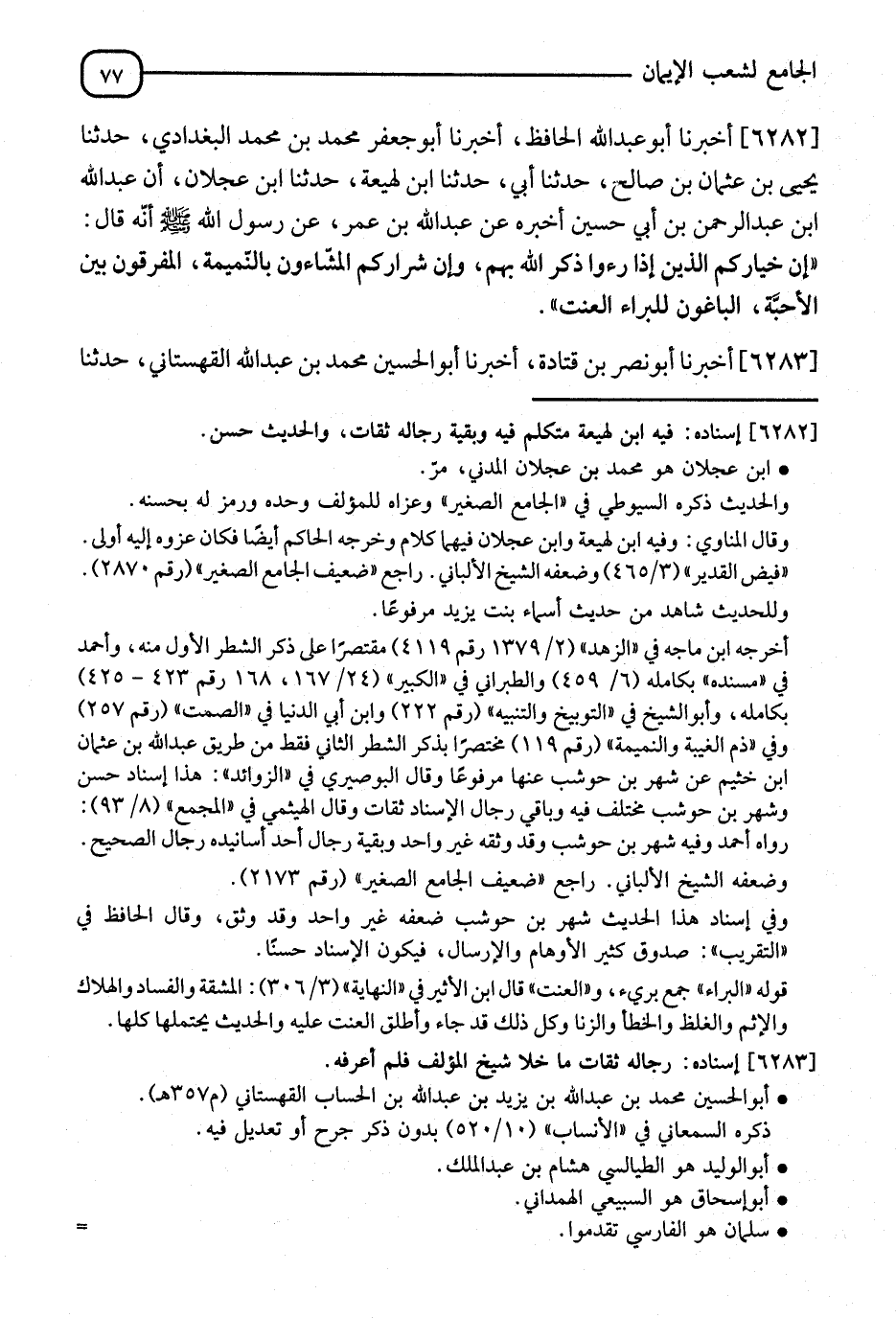 6282 - أَخْبَرَنَا أَبُو عَبْدِ اللهِ الْحَافِظُ، أَنَا أَبُو جَعْفَرٍ مُحَمَّدُ بْنُ مُحَمَّدٍ الْبَغْدَادِيُّ، نا يَحْيَى بْنُ عُثْمَانَ بْنِ صَالِحٍ، نا أَبِي، نا ابْنُ لَهِيعَةَ، حَدَّثَنِي ابْنُ عَجْلَانَ، أَنَّ عَبْدَ اللهِ بْنَ عَبْدِ الرَّحْمَنِ بْنِ أَبِي الْحُسَيْنِ أَخْبَرَهُ، عَنْ عَبْدِ اللهِ بْنِ عُمَرَ، عَنْ رَسُولِ اللهِ صَلَّى اللَّهُ عَلَيْهِ وَسَلَّمَ، أَنَّهُ قَالَ: " §خِيَارَكُمُ الَّذِينَ إِذَا رُؤُوا ذُكِرَ اللهُ بِهِمْ، وَإِنَّ شِرَارَكُمُ الْمَشَّاؤُونَ بِالنَّمِيمَةِ بَيْنَ الْأَحِبَّةِ الْبَاغُونَ لِلْبُرَآءِ الْعَنَتَ "