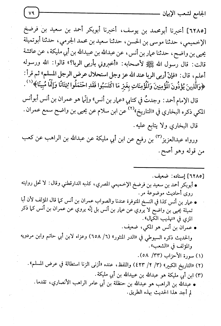 6285 - أَخْبَرَنَا أَبُو مُحَمَّدِ بْنُ يُوسُفَ، أَنَا أَبُو بَكْرٍ أَحْمَدُ بْنُ سَعِيدِ بْنِ فَرْضَخٍ، نا مُوسَى بْنُ الْحَسَنِ، نا سَعِيدُ بْنُ مُحَمَّدٍ الْجَرْمِيُّ، نا أَبُو سَلَمَةَ يَحْيَى بْنُ وَاضِحٍ، نا عَمَّارُ بْنُ أَنَسٍ، عَنْ عَبْدِ اللهِ بْنِ عُبَيْدِ اللهِ بْنِ أَبِي مُلَيْكَةُ، عَنْ عَائِشَةَ، قَالَتْ: قَالَ رَسُولُ اللهِ صَلَّى اللَّهُ عَلَيْهِ وَسَلَّمَ لِأَصْحَابِهِ: " أَخْبِرُونِي مَا أَرْبَى الرِّبَا؟ " قَالُوا: اللهُ وَرَسُولُهُ أَعْلَمُ. قَالَ: " فَإِنَّ §أَرْبَى الرِّبَا عِنْدَ اللهِ عَزَّ وَجَلَّ اسْتِحْلَالُ عِرْضِ الْمُسْلِمِ، ثُمَّ قَرَأَ: {وَالَّذِينَ يُؤْذُونَ الْمُؤْمِنِينَ وَالْمُؤْمِنَاتِ بِغَيْرِ مَا اكْتَسَبُوا فَقَدِ احْتَمَلُوا بُهْتَانًا وَإِثْمًا مُبِينًا} [الأحزاب: 58] " قَالَ الْإِمَامُ أَحْمَدُ: " وَجَدْتُ فِي كِتَابِي: عَمَّارَ بْنَ أَنَسٍ، فَإِنَّمَا هُوَ، عِمْرَانُ بْنُ أَنَسٍ أَبُو أَنَسٍ الْمَكِّيُّ " ذِكْرُهُ الْبُخَارِيُّ فِي التَّارِيخِ، عَنْ أَبِي سَلَّامٍ، عَنْ يَحْيَى بْنِ وَاضِحٍ، سَمِعَ عِمْرَانَ. قَالَ الْبُخَارِيُّ: لَا يُتَابَعُ عَلَيْهِ، وَرَوَاهُ عَبْدُ الْعَزِيزِ بْنُ رُفَيْعٍ، عَنِ ابْنِ أَبِي مُلَيْكَةَ، عَنْ عَبْدِ اللهِ بْنِ الرَّاهِبِ، عَنْ كَعْبٍ مِنْ قَوْلِهِ وَهُوَ أَصَحُّ