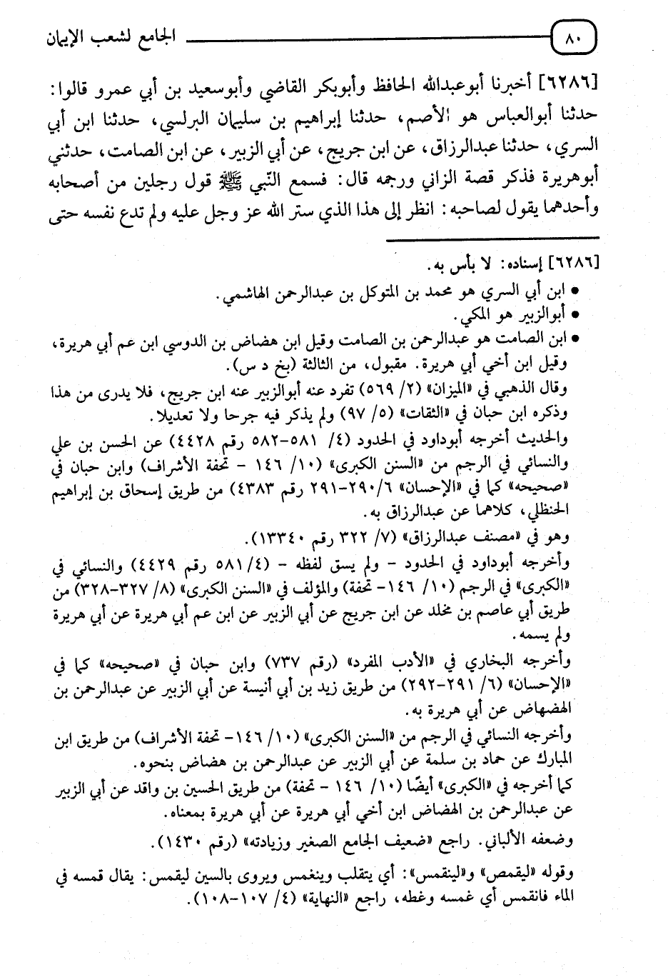 6286 - أَخْبَرَنَا أَبُو عَبْدِ اللهِ الْحَافِظُ، وَأَبُو بَكْرٍ الْقَاضِي، وَأَبُو سَعِيدِ بْنُ أَبِي عَمْرٍو، قَالُوا: ثَنَا أَبُو الْعَبَّاسِ هُوَ الْأَصَمُّ، ثَنَا إِبْرَاهِيمُ بْنُ سُلَيْمَانَ هُوَ الْبُرُلُّسِيُّ، ثَنَا ابْنُ أَبِي السَّرِيِّ، نا عَبْدُ الرَّزَّاقِ، عَنِ ابْنِ جُرَيْجٍ، عَنْ أَبِي الزُّبَيْرِ، عَنِ ابْنِ الصَّامِتِ، حَدَّثَنِي أَبُو هُرَيْرَةَ، فَذَكَرَ قِصَّةَ الزَّانِي رَجْمَهُ. قَالَ: فَسَمِعَ النَّبِيُّ صَلَّى اللَّهُ عَلَيْهِ وَسَلَّمَ قَوْلَ رَجُلَيْنِ مِنْ أَصْحَابِهِ، وَأَحَدُهُمَا يَقُولُ لِصَاحِبِهِ: انْظُرْ إِلَى هَذَا الَّذِي سَتَرَ اللهُ عَزَّ وَجَلَّ عَلَيْهِ، لَمْ يَدَعْ نَفْسَهُ حَتَّى -[81]- رُجِمَ كَمَا يُرْجَمُ الْكَلْبُ، فَسَكَتَ عَنْهُمَا رَسُولُ اللهِ صَلَّى اللَّهُ عَلَيْهِ وَسَلَّمَ، حَتَّى مَرَّ بِجَدْيٍ مَيِّتٍ سَابِلٍ رِجْلُهُ، فَقَالَ لَهُمَا النَّبِيُّ صَلَّى اللَّهُ عَلَيْهِ وَسَلَّمَ: " §انْزِلَا وَكُلَا "، فَقَالَا: غَفَرَ اللهُ لَكَ يَا رَسُولَ اللهِ وَمَنْ يَسْتَطِيعُ أَنْ يَأْكُلَ مِنْ هَذَا؟ فَقَالَ: " وَاللهِ مَا نِلْتُمَا مِنْ أَخِيكُمَا أَشَدُّ مِنْ أَكْلِكُمَا هَذِهِ، وَإِنَّهُ لَغَمِيسٌ فِي أَنْهَارِ الْجَنَّةِ "، وَقِيلَ لَيَنْغَمِسُ. عَبْدُ الرَّزَّاقِ يَقُولُ: عَبْدُ الرَّحْمَنِ بْنُ الصَّامِتِ، أَوْ عَبْدُ اللهِ، وَحَمَّادُ بْنُ سَلَمَةَ، يَقُولُ: عَنْ أَبِي الزُّبَيْرِ، عَنْ عَبْدِ الرَّحْمَنِ بْنِ النَّهَّاسِ