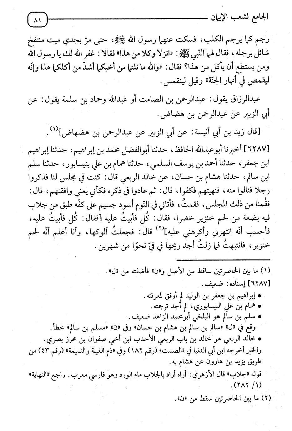 6287 - أَخْبَرَنَا أَبُو عَبْدِ اللهِ الْحَافِظُ، نَا أَبُو الْفَضْلِ مُحَمَّدُ بْنُ إِبْرَاهِيمَ، نَا إِبْرَاهِيمُ بْنُ جَعْفَرٍ، نا أَحْمَدُ بْنُ يُوسُفَ السَّلَمِيُّ، نا هَمَّامُ بْنُ عَلِيٍّ، بِنَيْسَابُورَ، نا مُسْلِمُ بْنُ مُسْلِمٍ، نا هِشَامُ بْنُ حَسَّانٍ، عَنْ خَالِدٍ الرَّبَعِيِّ، قَالَ: " كُنْتُ فِي §مَجْلِسٍ لَنَا فَذَكَرُوا رَجُلًا فَنَالُوا مِنْهُ فَنَهَيْتُهُمْ فَكَفُّوا، قَالَ: ثُمَّ عَادُوا فِي ذِكْرِهِ فَكَأَنِّي يَعْنِي وَافْقَتْهُمْ، قَالَ: فَقُمْنَا مِنْ ذَلِكَ الْمَجْلِسِ فَنِمْتُ فَأَتَانِي فِي الْمَنَامِ أَسْوَدُ جَسِيمٌ عَلَى كَفِّهِ طَبَقٌ مِنْ خِلَابٍ فِيهِ بِضْعَةٌ مِنْ لَحْمِ خِنْزِيرٍ خَضْرَاءَ، فَقَالَ: كُلْ، فَأَبَيْتُ عَلَيْهِ، فَقَالَ: كُلْ، فَأَبَيْتُ عَلَيْهِ، فَأَحْسِبُ أَنَّهُ انْتَهَرَنِي وَأَكْرَهَنِي عَلَيْهِ، قَالَ: فَجَعَلْتُ أَلُوكُهَا وَأَنَا أَعْلَمُ أَنَّهُ لَحْمُ خِنْزِيرٍ، فَانْتَهَتْ فَمَا زِلْتُ أَجِدَ رِيحَهَا فِي فِيَّ نَحْوًا مِنْ شَهْرَيْنِ "