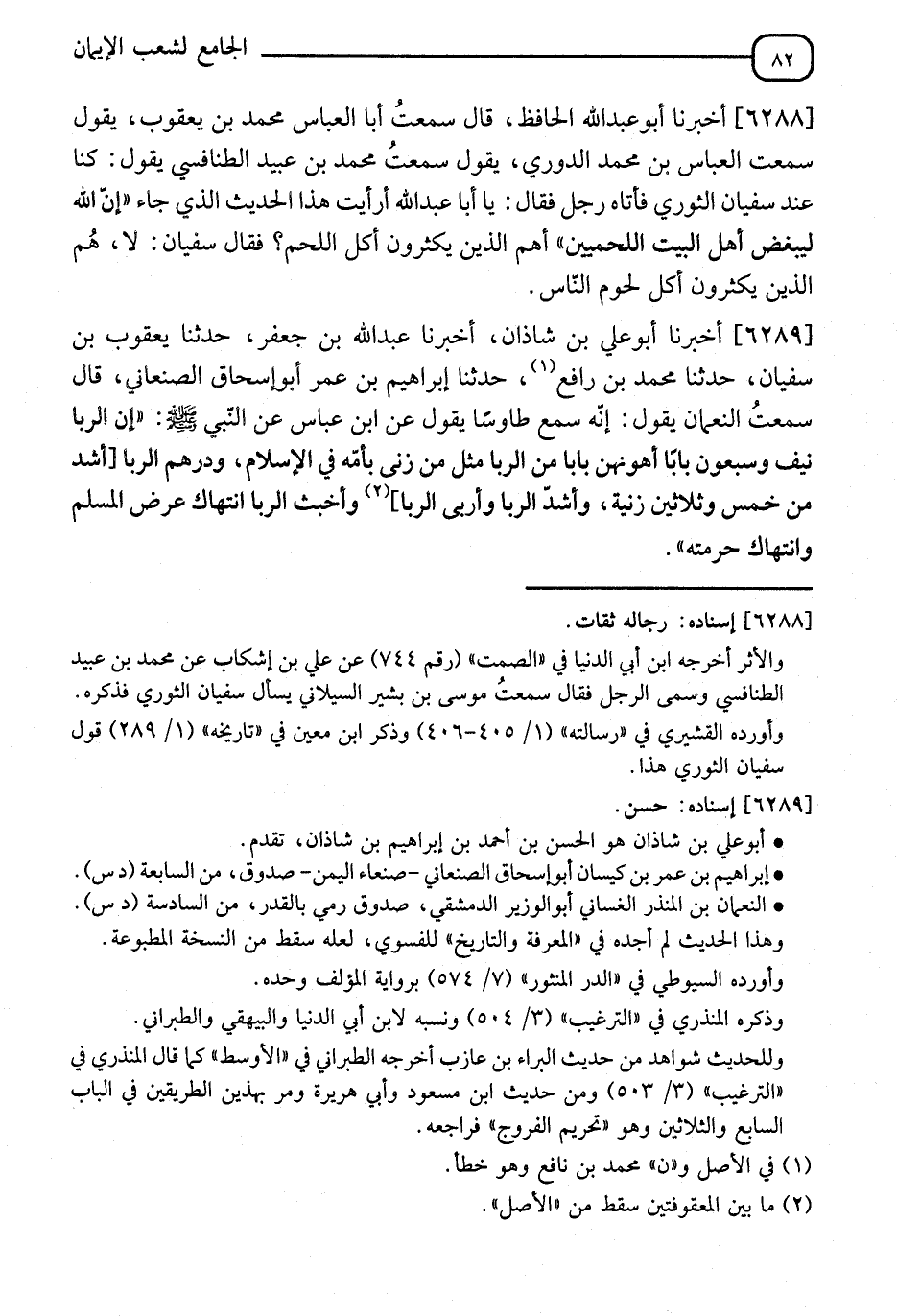 6288 - أَخْبَرَنَا أَبُو عَبْدِ اللهِ الْحَافِظُ، قَالَ: سَمِعْتُ أَبَا الْعَبَّاسِ مُحَمَّدَ بْنَ يَعْقُوبَ، يَقُولُ: سَمِعْتُ الْعَبَّاسَ بْنَ مُحَمَّدٍ الدُّورِيَّ، يَقُولُ: سَمِعْتُ مُحَمَّدَ بْنَ عُبَيْدٍ الطَّنَافِسِيَّ، يَقُولُ: كُنَّا عِنْدَ سُفْيَانَ الثَّوْرِيِّ فَأَتَاهُ رَجُلٌ، فَقَالَ: يَا أَبَا عَبْدِ اللهِ، أَرَأَيْتَ هَذَا الْحَدِيثَ الَّذِي جَاءَ: إِنَّ §اللهَ لَيُبْغِضُ أَهْلَ الْبَيْتِ اللَّحْمِيِّينَ الَّذِينَ يُكْثِرُونَ أَكْلَ اللَّحْمِ. قَالَ سُفْيَانُ: " لَا هُمُ الَّذِينَ يُكْثِرُونَ أَكْلَ لُحُومِ النَّاسِ "
