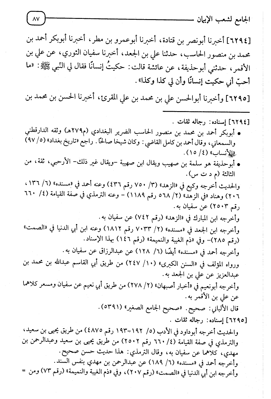 6294 - أَخْبَرَنَا أَبُو نَصْرِ بْنُ قَتَادَةَ، أَنَا أَبُو عَمْرِو بْنُ مَطَرٍ، أَنَا أَبُو بَكْرٍ أَحْمَدُ بْنُ مُحَمَّدِ بْنِ مَنْصُورٍ الْحَاسِبُ، نا عَلِيُّ بْنُ جَعْدٍ، نا سُفْيَانُ الثَّوْرِيُّ، عَنْ عَلِيِّ بْنِ الْأَقْمَرِ، حَدَّثَنِي أَبُو حُذَيْفَةُ، عَنْ عَائِشَةَ، قَالَتْ: حَكَيْتُ إِنْسَانًا، فَقَالَ النَّبِيُّ صَلَّى اللَّهُ عَلَيْهِ وَسَلَّمَ: §" مَا أُحِبُّ أَنِّي حَكَيْتُ إِنْسَانًا وَإِنَّ لِي كَذَا وَكَذَا "