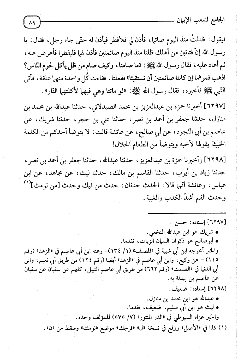 6297 - أَخْبَرَنَا حَمْزَةُ بْنُ عَبْدِ الْعَزِيزِ بْنِ مُحَمَّدٍ الصَّيْدَلَانِيُّ، نا عَبْدُ اللهِ بْنُ مُحَمَّدٍ الصَّيْدَلَانِيُّ، نا عَبْدُ اللهِ بْنُ مُحَمَّدِ بْنِ مُنَازِلٍ، نا جَعْفَرُ بْنُ أَحْمَدَ بْنِ نَصْرٍ، نا عَلِيُّ بْنُ حُجْرٍ، نا شَرِيكٌ، عَنْ عَاصِمِ بْنِ أَبِي النَّجُودِ، عَنْ أَبِي صَالِحٍ، عَنْ عَائِشَةَ، قَالَتْ: " §لَا يَتَوَضَّأُ أَحَدُكُمْ مِنَ الْكَلِمَةِ الْخَبِيثَةِ يَقُولُهَا لِأَخِيهِ، وَيَتَوَضَّأُ مِنَ الطَّعَامِ الْحَلَالِ "
