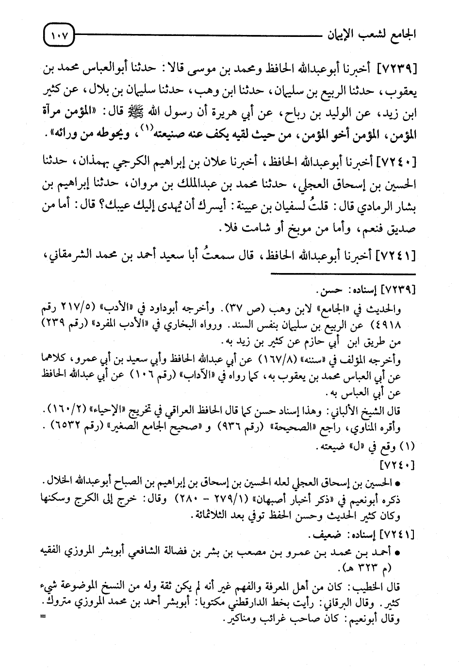 7239 - أَخْبَرَنَا أَبُو عَبْدِ اللهِ الْحَافِظُ، وَمُحَمَّدُ بْنُ مُوسَى، قَالَا: نا أَبُو الْعَبَّاسِ مُحَمَّدُ بْنُ يَعْقُوبَ، نا الرَّبِيعُ بْنُ سُلَيْمَانَ، نا ابْنُ وَهْبٍ، نا سُلَيْمَانُ بْنُ بِلَالٍ، عنْ كَثِيرِ بْنِ زَيْدٍ، عَنِ الْوَلِيدِ بْنِ رَبَاحٍ، عَنْ أَبِي هُرَيْرَةَ، أَنَّ رَسُولَ اللهِ صَلَّى اللَّهُ عَلَيْهِ وَسَلَّمَ قَالَ: " §الْمُؤْمِنُ مِرْآةُ الْمُؤْمِنِ، وَالْمُؤْمِنُ أَخُو الْمُؤْمِنِ مِنْ حَيْثُ لَقِيَهُ يَكُفُّ عَنْهُ ضَيْعَتَهُ، وَيَحُوطُهُ مِنْ وَرَائِهِ "