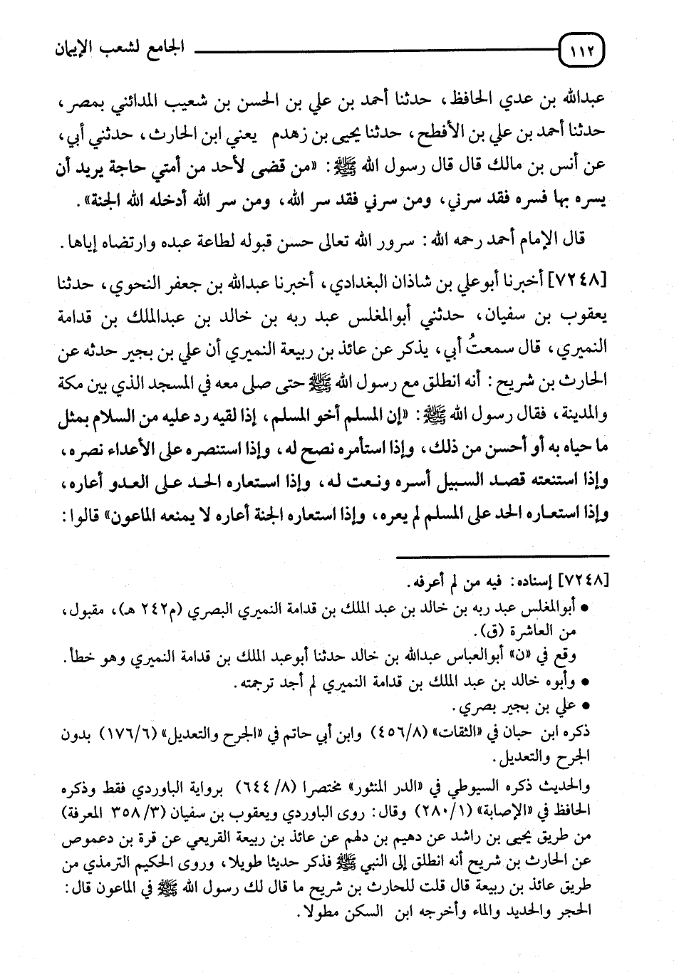 7248 - أَخْبَرَنَا أَبُو عَلِيِّ بْنُ شَاذَانَ الْبَغْدَادِيُّ، أنا عَبْدُ اللهِ بْنُ جَعْفَرٍ النَّحْوِيُّ، نا يَعْقُوبُ بْنُ سُفْيَانَ، حَدَّثَنِي أَبُو الْمُغَلِّسِ عَبْدُ رَبِّهِ بْنُ خَالِدِ بْنِ عَبْدِ الْمَلَكِ بْنِ قُدَامَةَ النُّمَيْرِيُّ، قَالَ: سَمِعْتُ أَبِي يَذْكُرُ، عَنْ عَابِدِ بْنِ رَبِيعَةَ النُّمَيْرِيِّ، أَنَّ عَلِيَّ بْنَ بَحِيرٍ حَدَّثَهُ، عَنِ الْحَارِثِ بْنِ شُرَيْحٍ، أَنَّهُ انْطَلَقَ مَعَ رَسُولِ اللهِ صَلَّى اللَّهُ عَلَيْهِ وَسَلَّمَ حَتَّى صَلَّى مَعَهُ فِي الْمَسْجِدِ الَّذِي بَيْنَ مَكَّةَ، وَالْمَدِينَةِ، فَقَالَ رَسُولُ اللهِ صَلَّى اللَّهُ عَلَيْهِ وَسَلَّمَ: " إِنَّ §الْمُسْلِمَ أَخُو الْمُسْلِمِ، إِذَا لَقِيَهُ رَدَّ عَلَيْهِ مِنَ السَّلَامِ بِمِثْلِ مَا حَيَّاهُ بِهِ أَوْ أَحْسَنَ مِنْ ذَلِكَ، وَإِذَا أَسْتَأْمَرَهُ نَصَحَ لَهُ، وَإِذَا اسْتَنْصَرَهُ عَلَى الْأَعْدَاءِ نَصَرَهُ، وَإِذَا اسْتَنْعَتَهُ قَصْدَ السَّبِيلِ يَسَّرَهُ وَنَعَتَ لَهُ، وَإِذَا اسْتَعَارَهُ أَحَدٌ عَلَى الْعَدُوِّ أَعَارَهُ، وَإِذَا اسْتَعَارهُ أَحَدٌ لَمْ يُعِرْهُ وَإِذَا اسْتَعَارَهُ الْجُبَّةَ أَعَارَهُ، لَا يَمْنَعُهُ الْمَاعُونَ "، قَالُوا: -[113]- يَا رَسُولَ اللهِ: وَمَا الْمَاعُونُ؟ قَالَ رَسُولُ اللهِ صَلَّى اللَّهُ عَلَيْهِ وَسَلَّمَ: " الْمَاعُونُ فِي الْحَجَرِ وَالْمَاءِ وَالْحَدِيدِ " قَالُوا: وَأَيُّ الْحَدِيدِ؟ قَالَ: " قِدْرُ النُّحَاسِ، وَحَدِيدُ الْفَاسِ الَّذِي تَمْتَهِنُونَ بِهِ "، قَالُوا: فَمَا هَذَا الْحَجَرُ؟ قَالَ: " الْقِدْرُ مِنَ الْحِجَارَةِ "