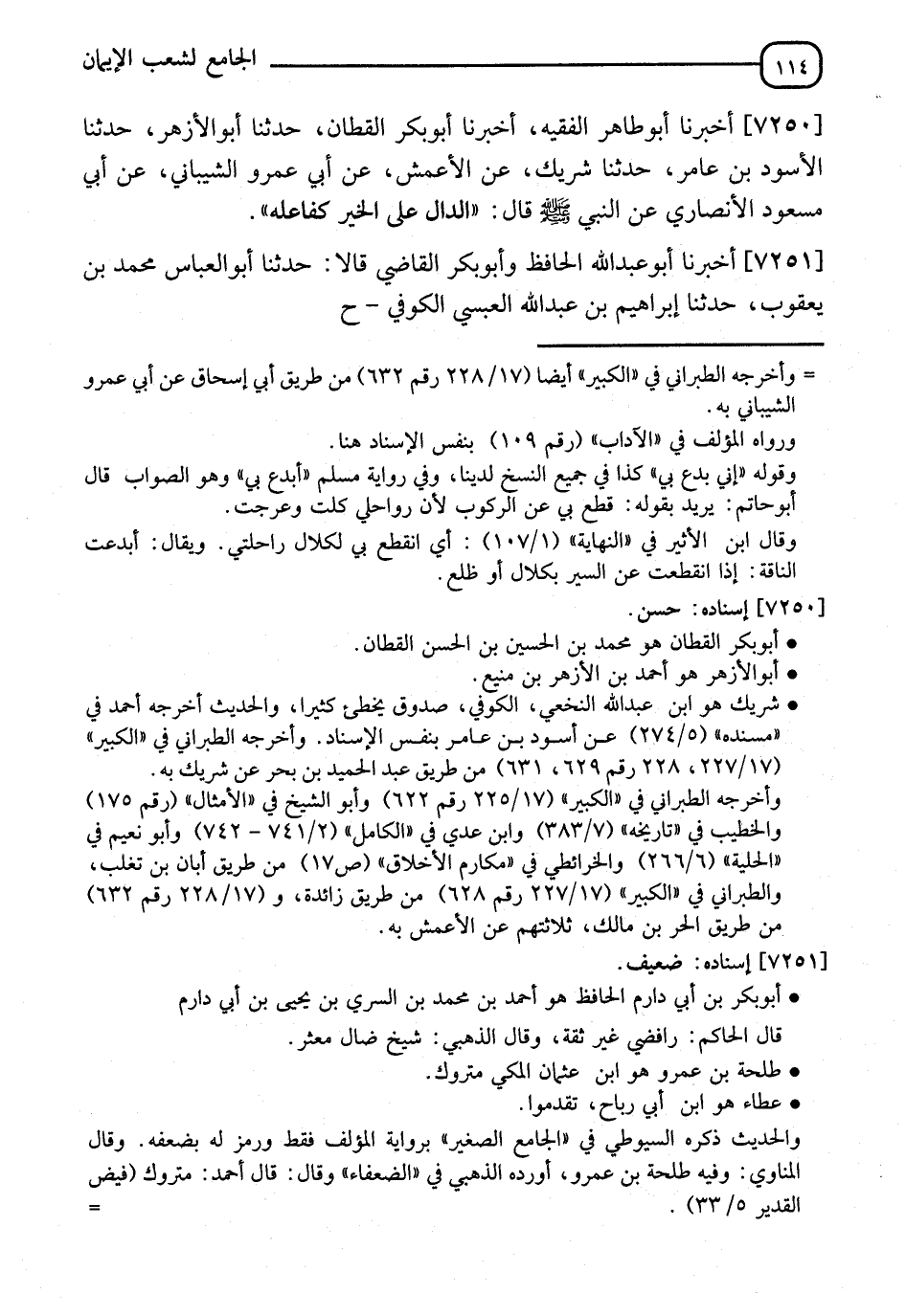7250 - أَخْبَرَنَا أَبُو طَاهِرٍ الْفَقِيهُ، أنا أَبُو بَكْرٍ الْقَطَّانُ، نا أَبُو الْأَزْهَرِ، نا الْأَسْوَدُ بْنُ عَامِرٍ، نا شَرِيكٌ، عَنِ الْأَعْمَشِ، عَنْ أَبِي عَمْرٍو الشَّيْبَانِيِّ، عَنْ أَبِي مَسْعُودٍ الْأَنْصَارِيِّ، عَنِ النَّبِيِّ صَلَّى اللَّهُ عَلَيْهِ وَسَلَّمَ قَالَ: §" الدَّالُّ عَلَى خَيْرٍ كَفَاعِلِهِ "