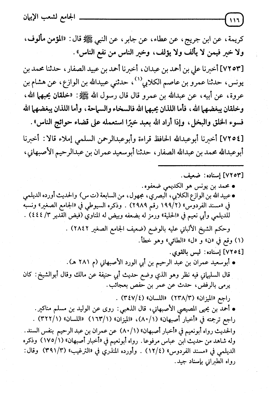 7253 - أَخْبَرَنَا عَلِيُّ بْنُ أَحْمَدَ بْنِ عَبْدَانَ، أنا أَحْمَدُ بْنُ عُبَيْدٍ، نا مُحَمَّدُ بْنُ يُونُسَ، نا عَمْرُو بْنُ عَاصِمٍ الْكِلَابِيُّ، حَدَّثَنِي عُبَيْدُ اللهِ بْنُ الْوَارِعِ، عَنْ هِشَامِ بْنِ عُرْوَةَ، عَنْ أَبِيهِ، عَنْ عَبْدِ اللهِ بْنِ عَمْرٍو، قَالَ: قَالَ رَسُولُ اللهِ صَلَّى اللَّهُ عَلَيْهِ وَسَلَّمَ: " §خُلُقَانِ يُحِبُّهُمَا اللهُ، وَخُلُقَانِ يَبْغَضُهُمَا اللهُ، فَأَمَّا اللَّذَانِ يُحِبُّهُمَا اللهُ: فالسَّخَاءُ وَالسَّمَاحَةُ، وَأَمَّا اللَّذَانِ يَبْغَضُهُمَا اللهُ فَسُوءُ الْخُلُقِ وَالْبُخْلُ، وَإِذَا أَرَادَ اللهُ بِعَبْدٍ خَيْرًا اسْتَعْمَلَهُ عَلَى قَضَاءِ حَوَائِجِ النَّاسِ "