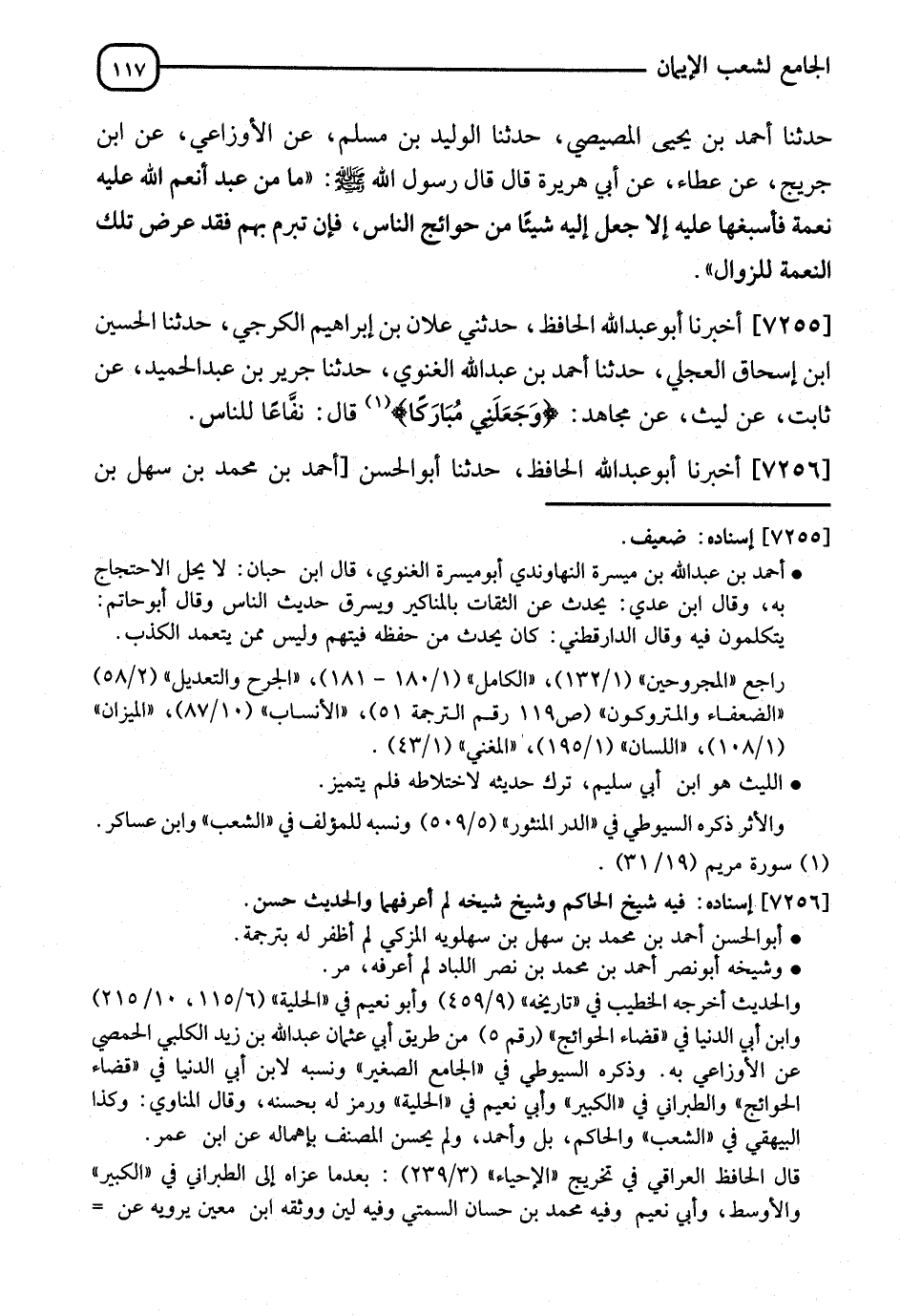 7256 - أَخْبَرَنَا أَبُو عَبْدِ اللهِ الْحَافِظُ، نا أَبُو الْحَسَنِ أَحْمَدُ بْنُ مُحَمَّدِ بْنِ سَهْلِ بْنِ -[118]- سَهْلَوَيْهِ الْمُزَكِّي، وَأَنَا سَأَلْتُهُ نا أَبُو نَصْرٍ أَحْمَدُ بْنُ مُحَمَّدِ بْنِ نَصْرٍ اللَّبَّادُ، نا أَحْمَدُ بْنُ حَنْبَلٍ، حَدَّثَنِي الْوَلِيدُ بْنُ مُسْلِمٍ، عَنِ الْأَوْزَاعِيِّ، عَنْ عَبْدَةَ بْنِ أَبِي لُبَابَةَ، عَنِ ابْنِ عُمَرَ، قَالَ: قَالَ رَسُولُ اللهِ صَلَّى اللَّهُ عَلَيْهِ وَسَلَّمَ: " إِنَّ §لِلَّهِ أَقْوَامًا اخْتَصَّهُمْ بِالنِّعَمِ لِمَنَافِعِ الْعِبَادِ، وَيُقِرُّهَا فِيهِمْ مَا بَذَلُوهَا، فَإِذَا مَنَعُوهَا نَزَعَهَا عَنْهُمْ وَحَوَّلَهَا إِلَى غَيْرِهِمْ "