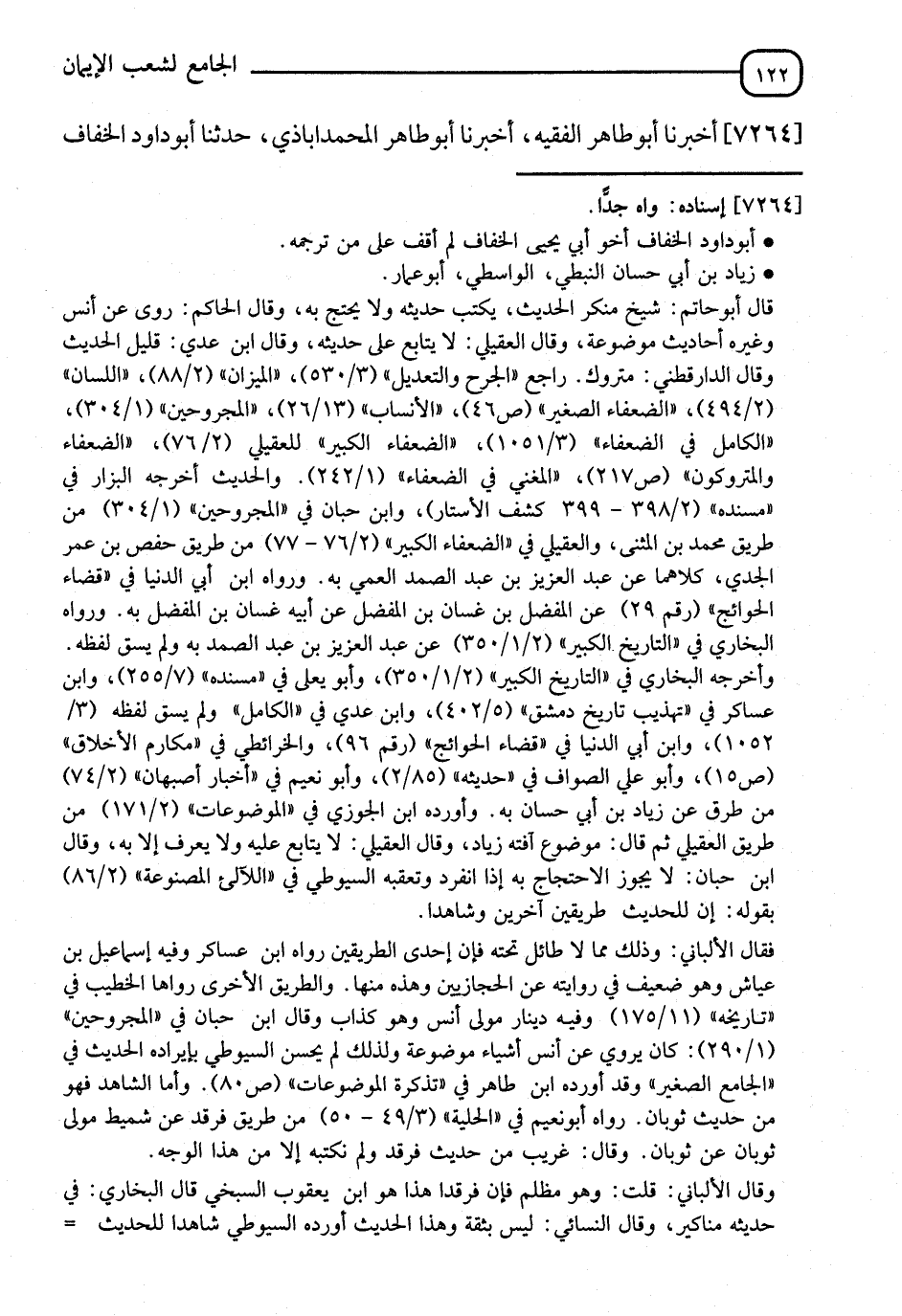 7264 - أَخْبَرَنَا أَبُو طَاهِرٍ الْفَقِيهُ، أنا أَبُو طَاهِرٍ الْمُحَمَّدْ آبَادِيُّ، نا أَبُو دَاوُدَ الْخَفَّافُ، -[123]- أَخُو أَبِي يَحْيَى الْخَفَّافِ، أنا غَسَّانُ بْنُ الْفَضْلِ، نا عَبْدُ الْعَزِيزِ بْنُ عَبْدِ الصَّمَدِ الْعَمِّيُّ، عَنْ زِيَادِ بْنِ أَبِي حَسَّانٍ، عَنْ أَنَسِ بْنِ مَالِكٍ، قَالَ: قَالَ رَسُولُ اللهِ صَلَّى اللَّهُ عَلَيْهِ وَسَلَّمَ: " §مَنْ أَغَاثَ مَلْهُوفًا كَتَبَ اللهُ لَهُ ثَلَاثًا وَسَبْعِينَ مَغْفِرَةً، وَاحِدَةٌ فِيهَا صَلَاحُ أَمْرِهِ كُلِّهِ، وَثِنْتَانِ وَسَبْعُونَ لَهُ دَرَجَاتٌ يَوْمَ الْقِيَامَةِ " قَالَ أَحْمَدُ: وَكَذَلِكَ رَوَاهُ مُسْلِمُ بْنُ الصَّلْتِ، عَنْ زِيَادٍ، وَتَفَرَّدَ بِهِ: زِيَادُ بْنُ أَبِي حَسَّانٍ